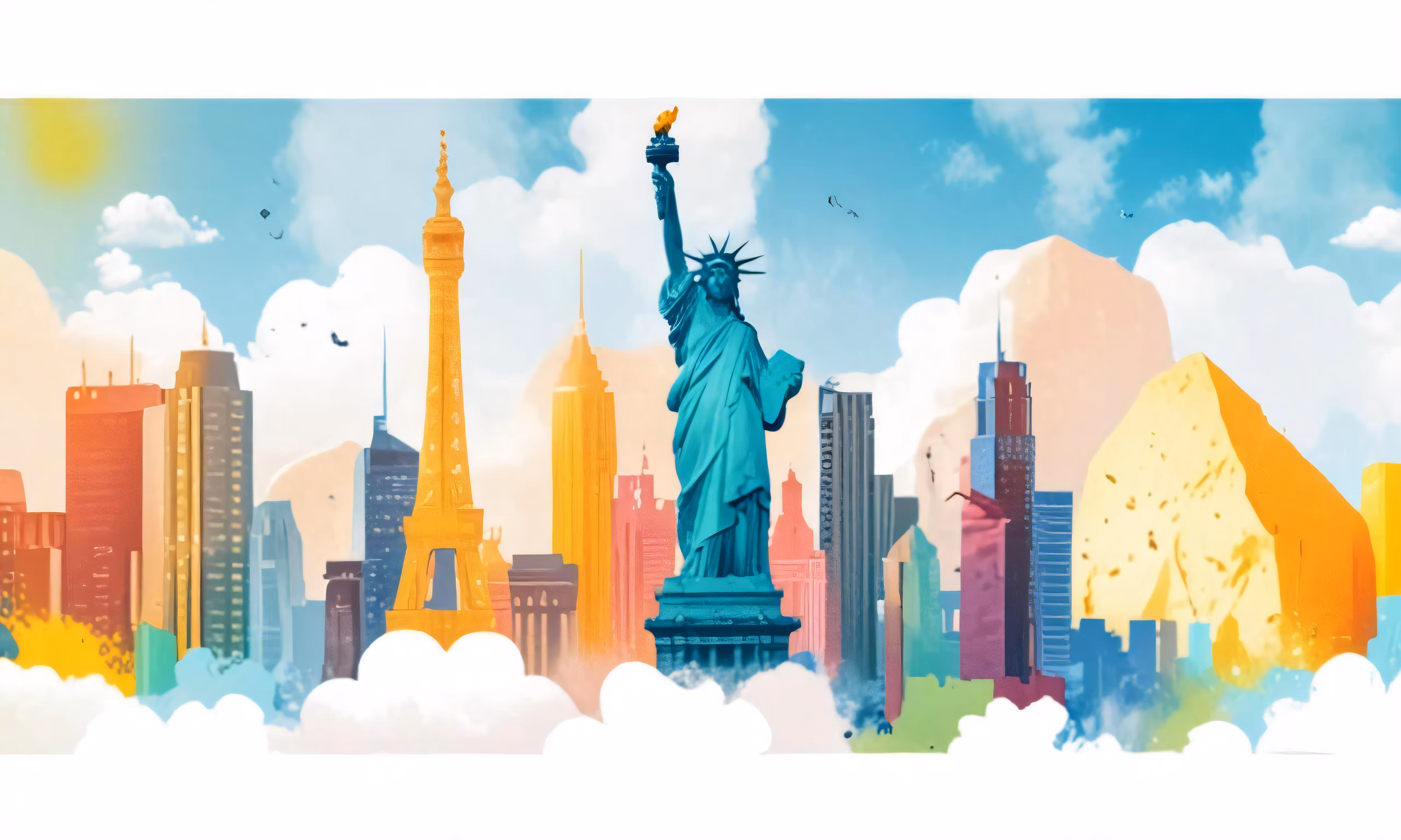 High resolution picture, free to use, a painting of the statue of liberty surrounded by clouds
