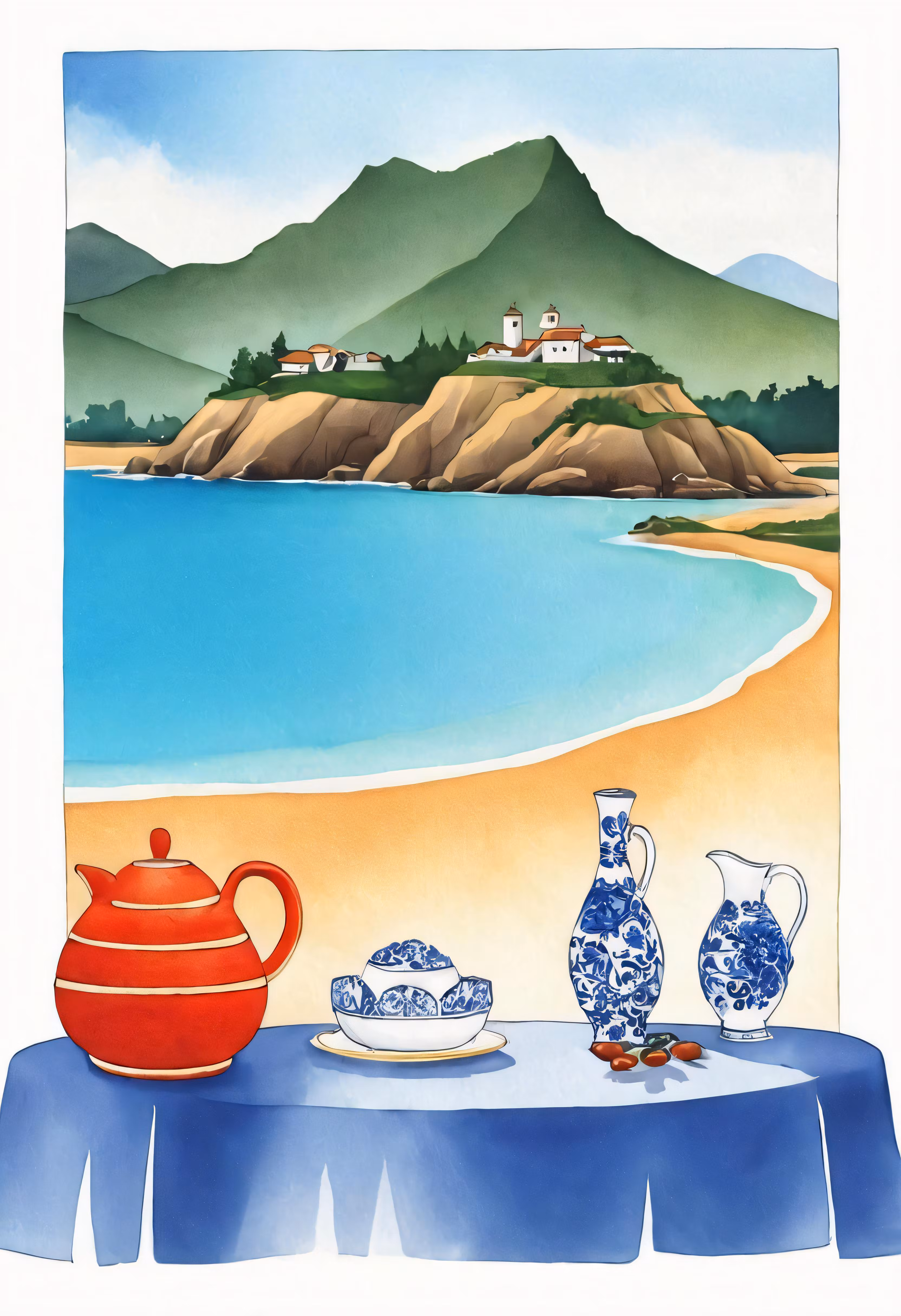 High resolution picture, free to use, a painting of three vases and a teapot on the beach