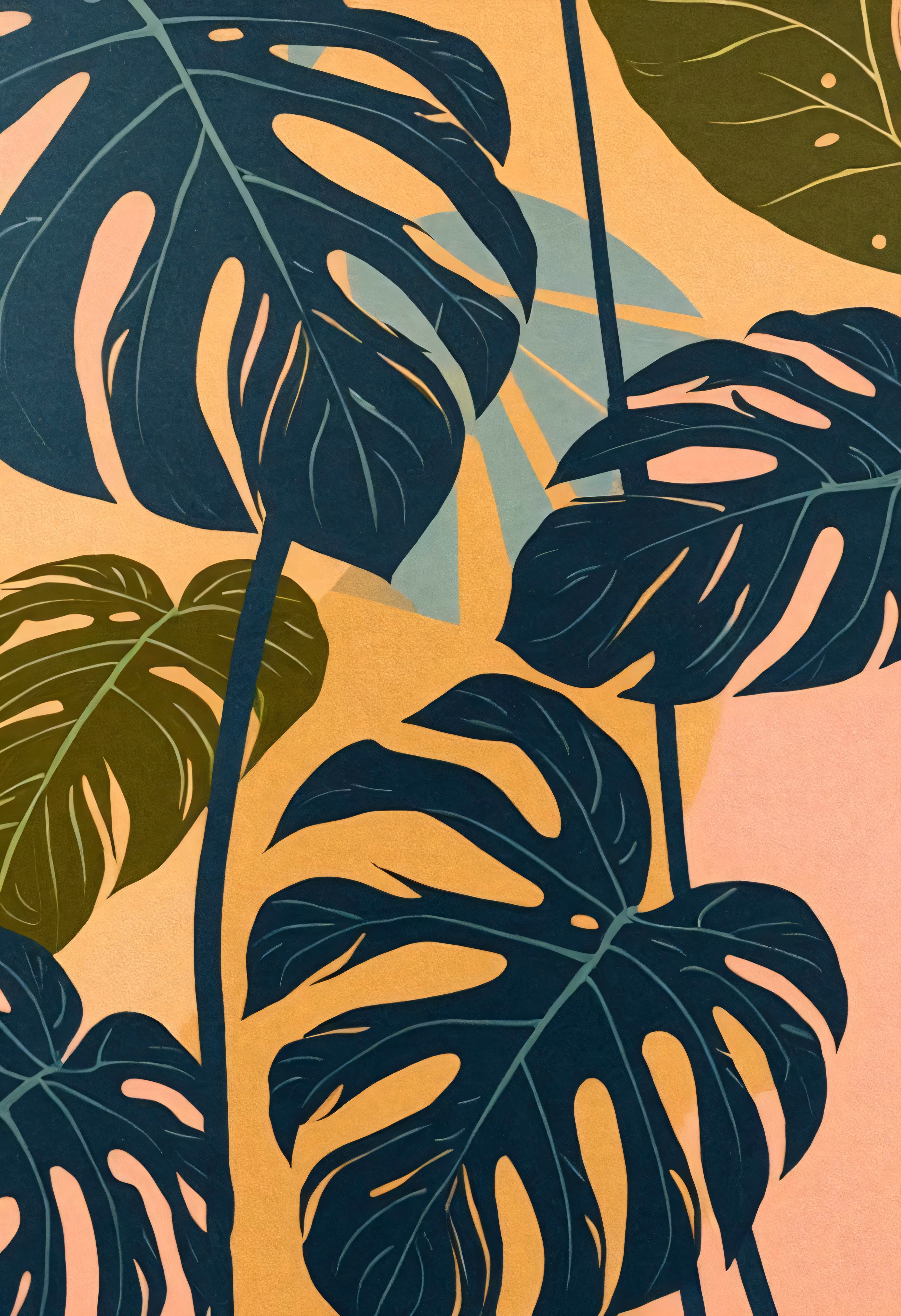 High resolution picture, free to use, a painting of tropical leaves on pink and blue