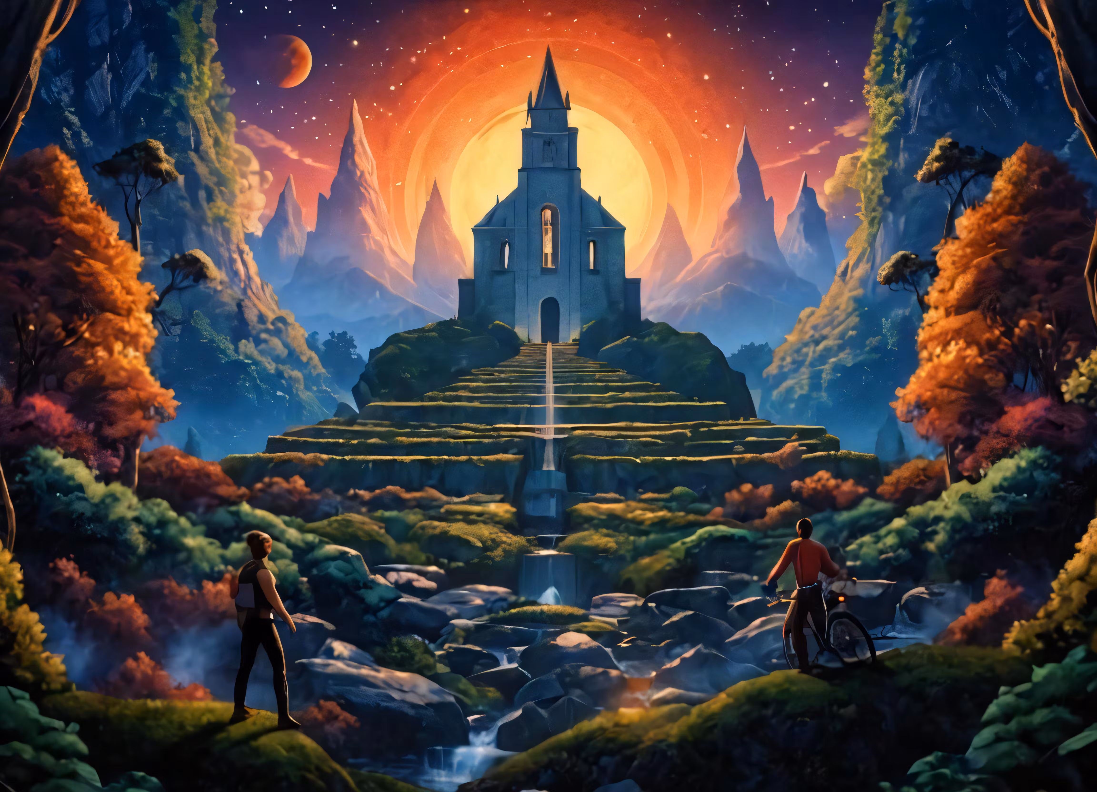 High resolution picture, free to use, a painting of two people walking near a mountain