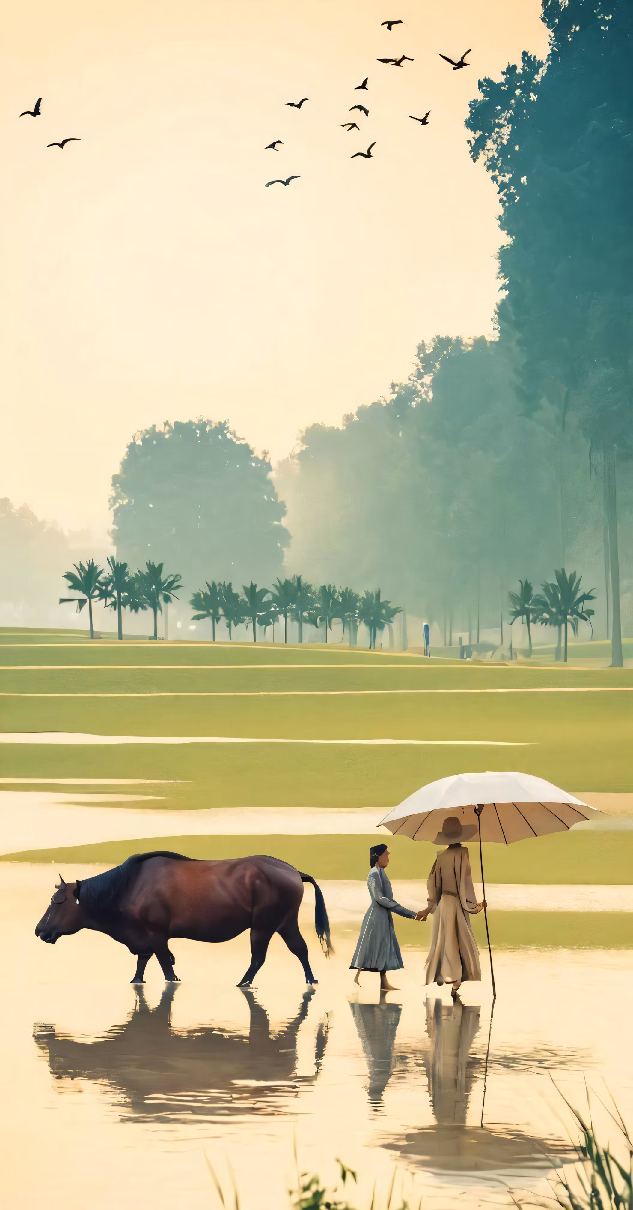 High resolution picture, free to use, a painting of two people with an umbrella and two animals