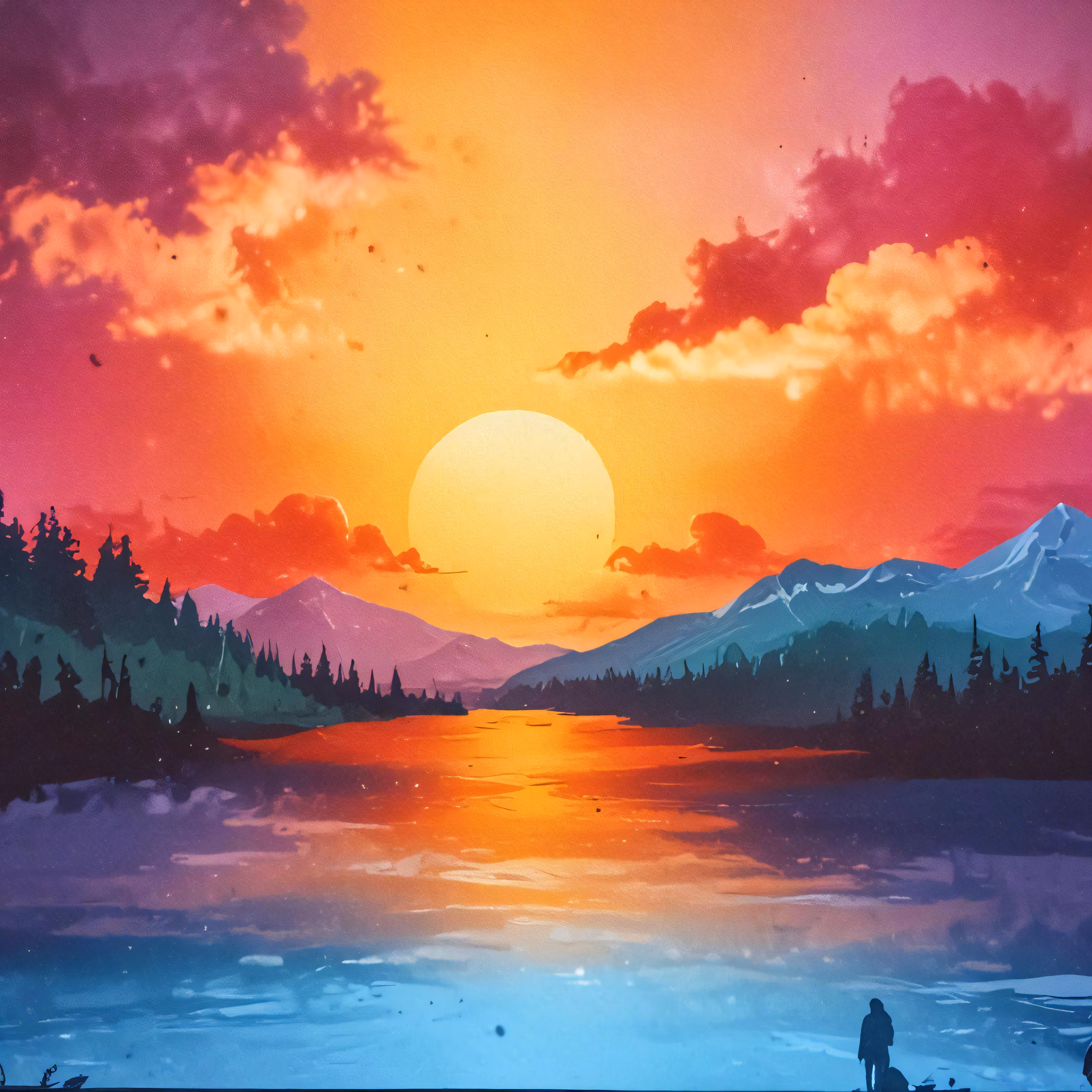 High resolution picture, free to use, a painting shows the sun over a lake and mountain range
