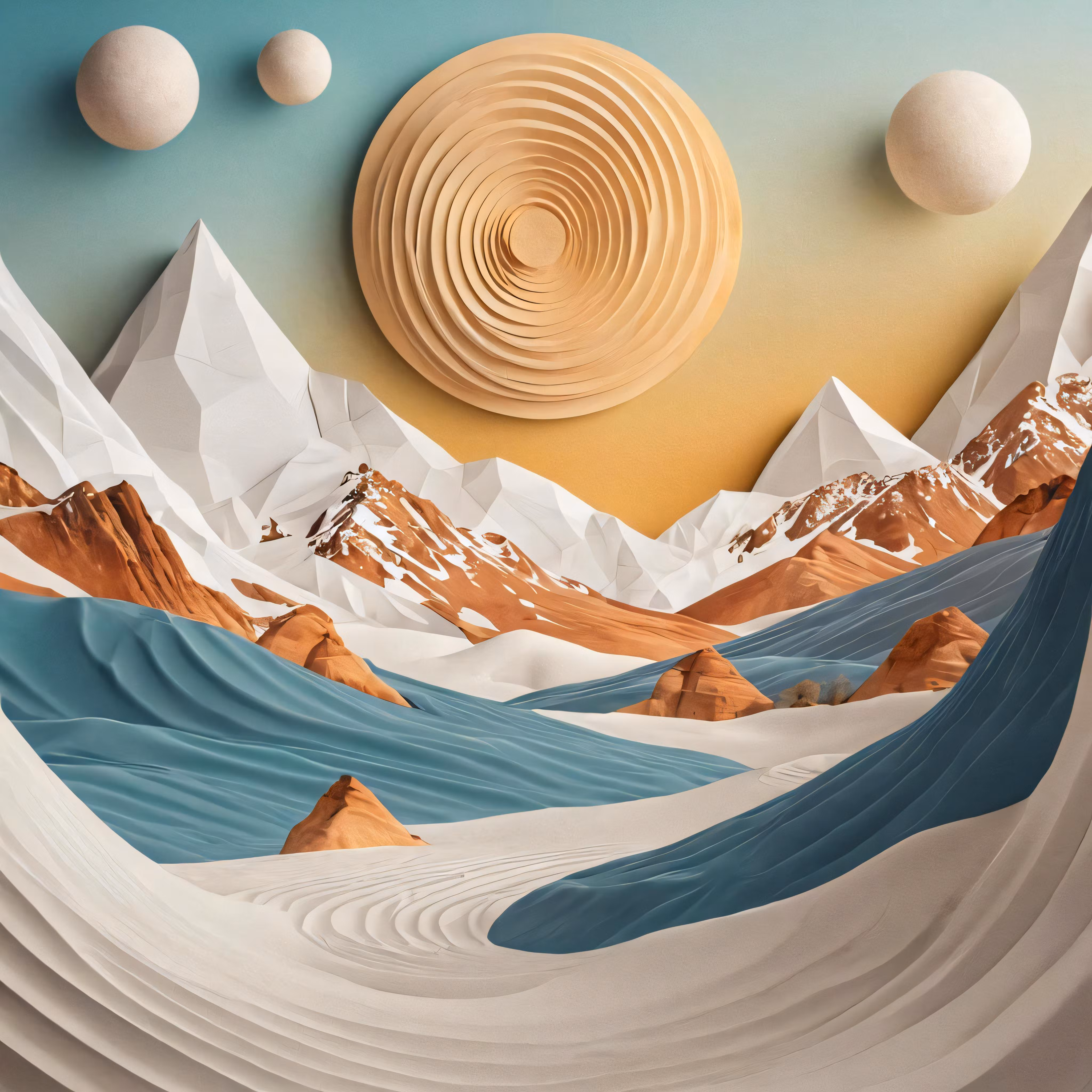 High resolution picture, free to use, a painting that has an image of mountains with sun above it