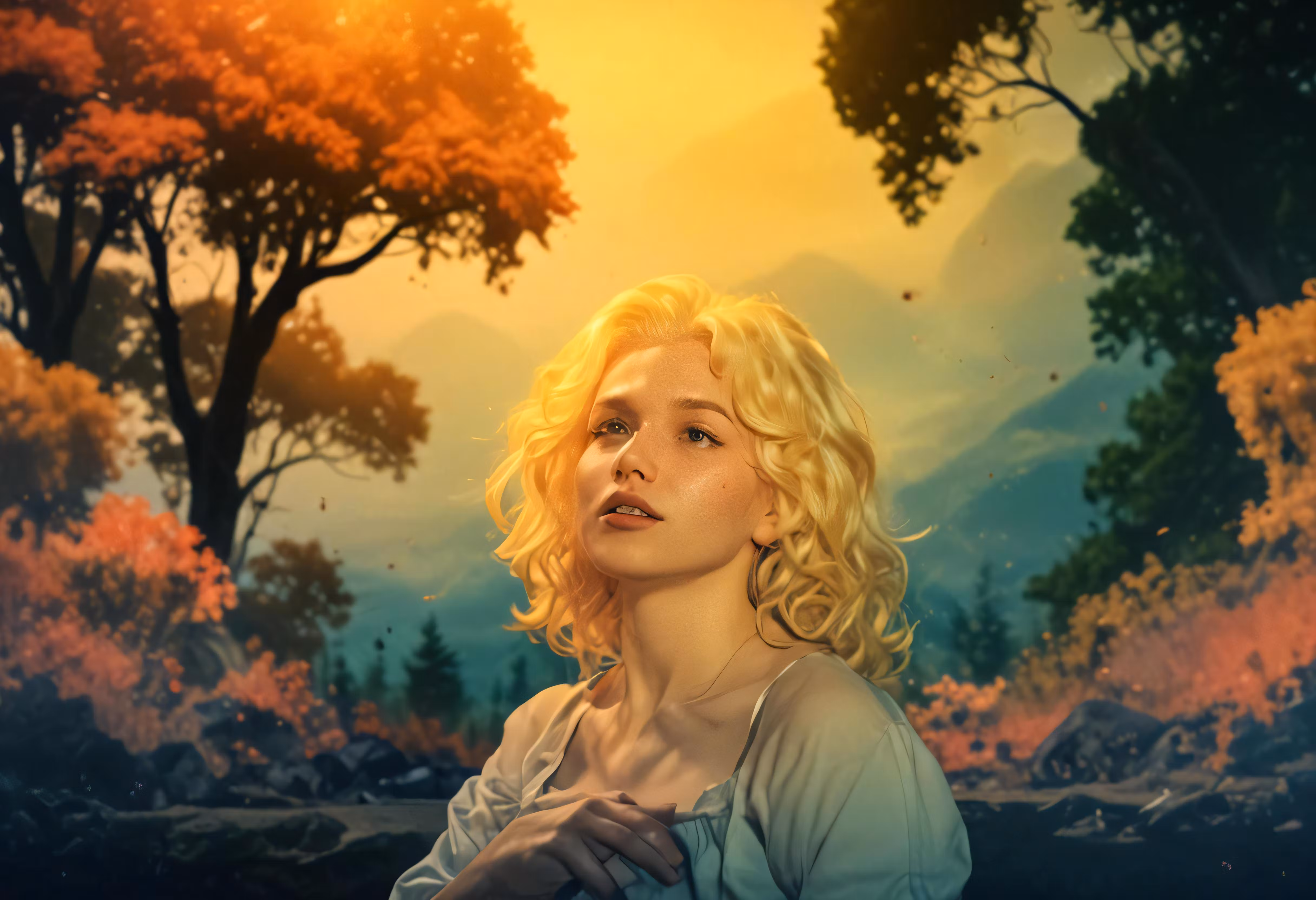 High resolution picture, free to use, a painting with a blonde haired woman staring away