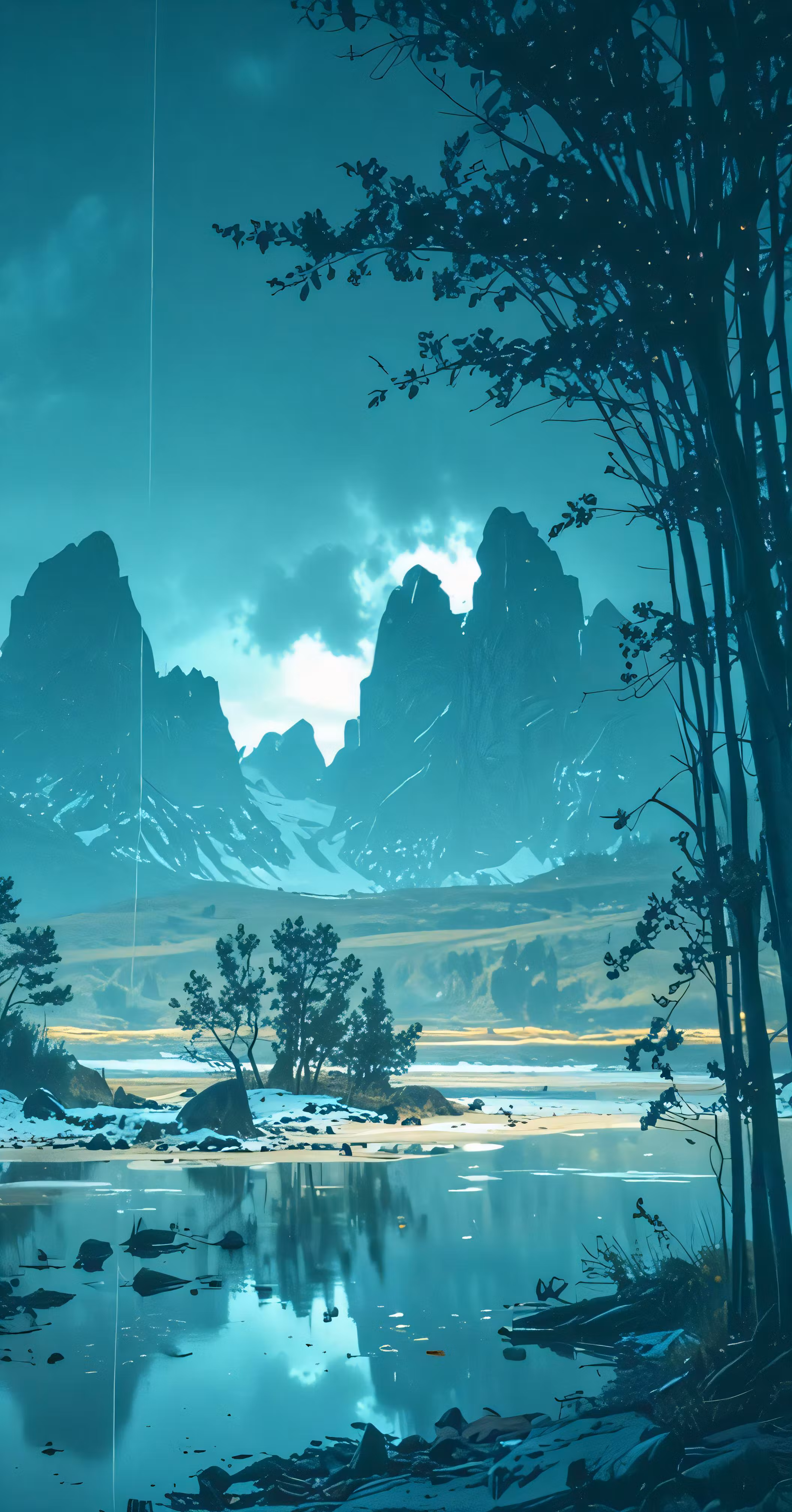 High resolution picture, free to use, a painting with a lake and mountain in the background