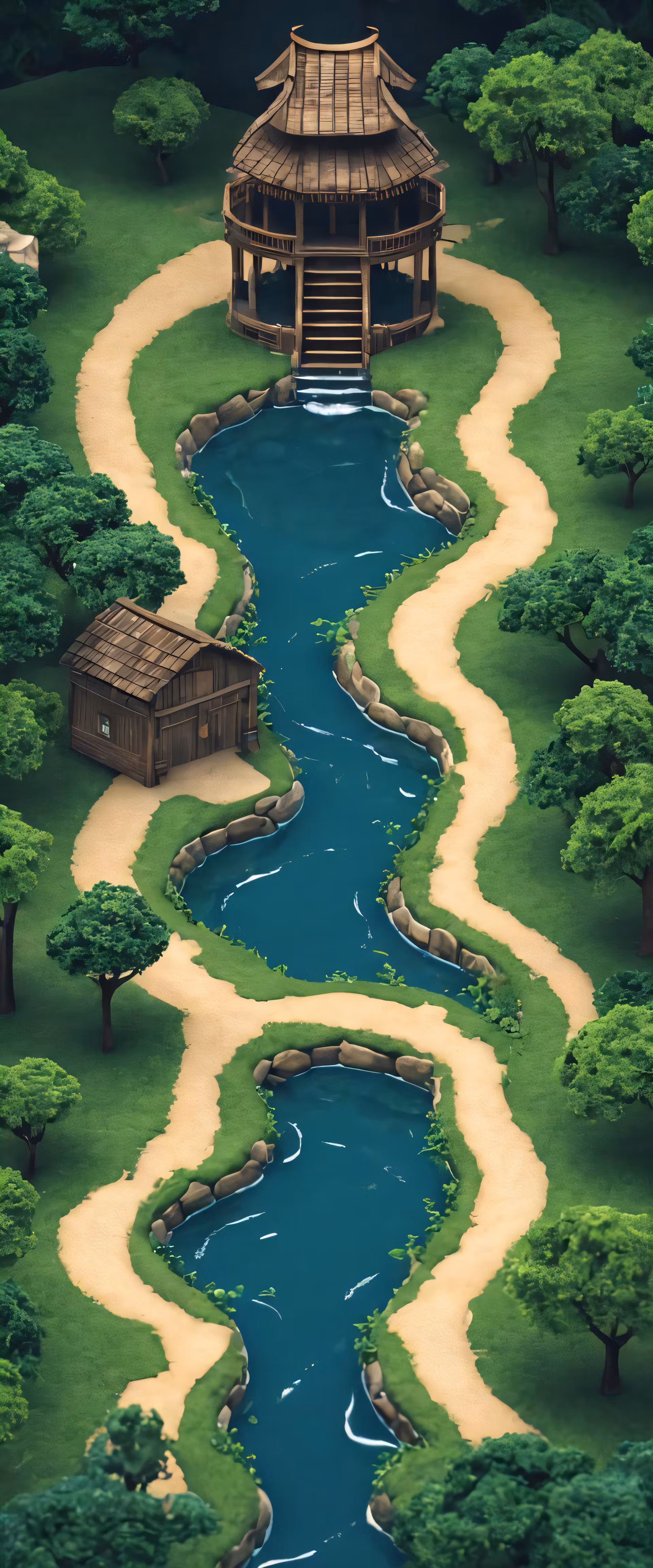 High resolution picture, free to use, a painting with a water scene, and a house on the other side