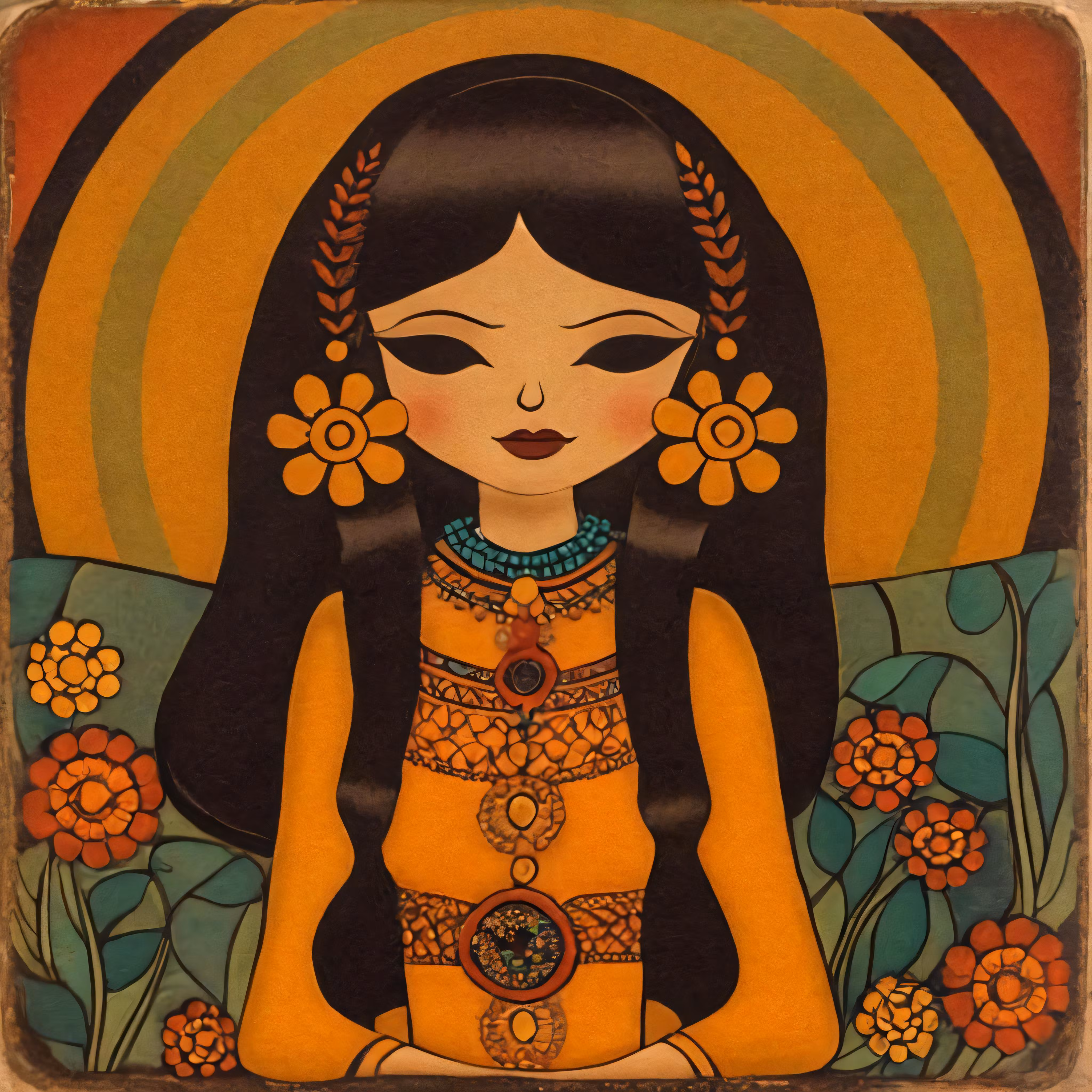 High resolution picture, free to use, a painting with flowers and a lady in the center