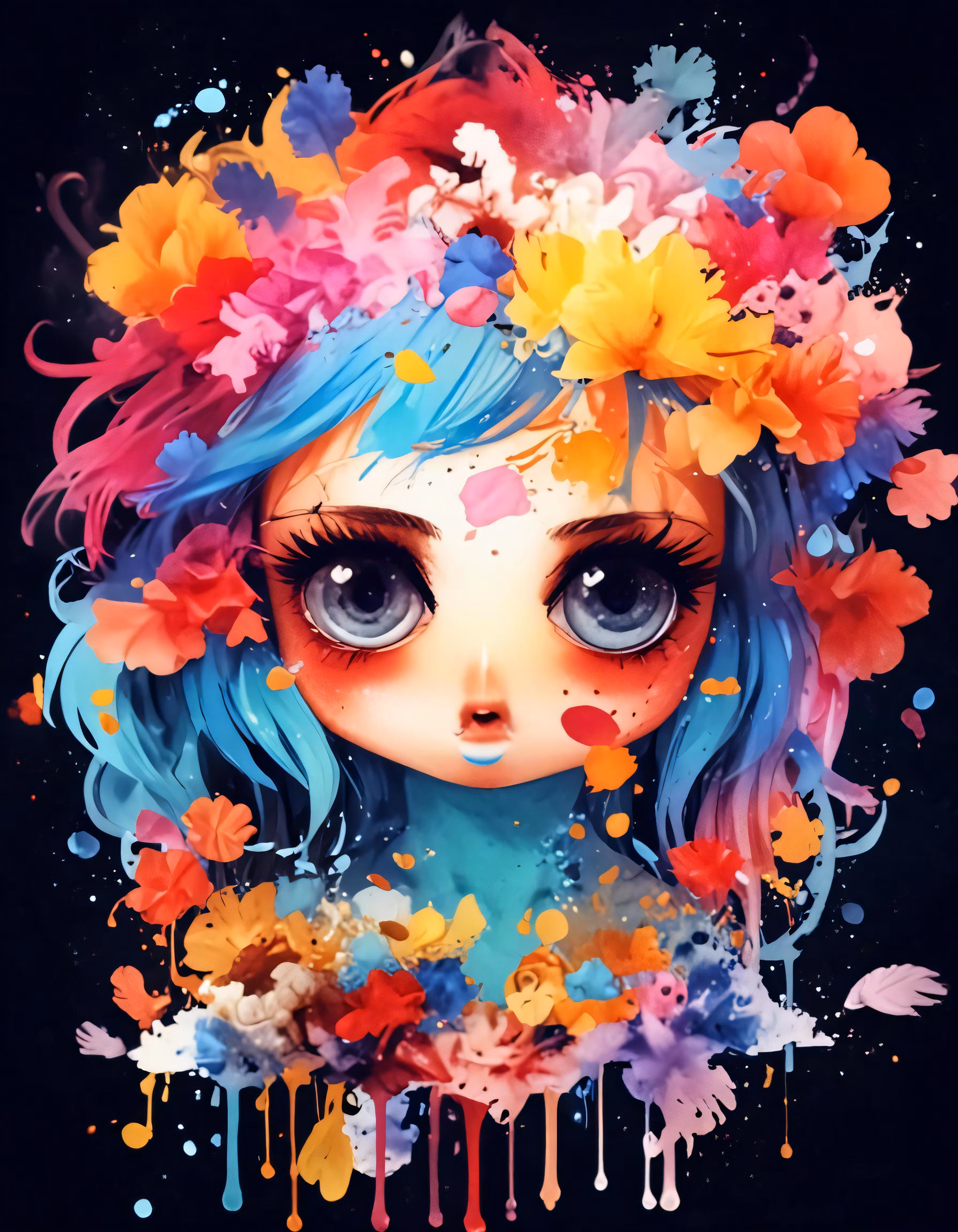 High resolution picture, free to use, a painting with flowers on her hair and big eyes