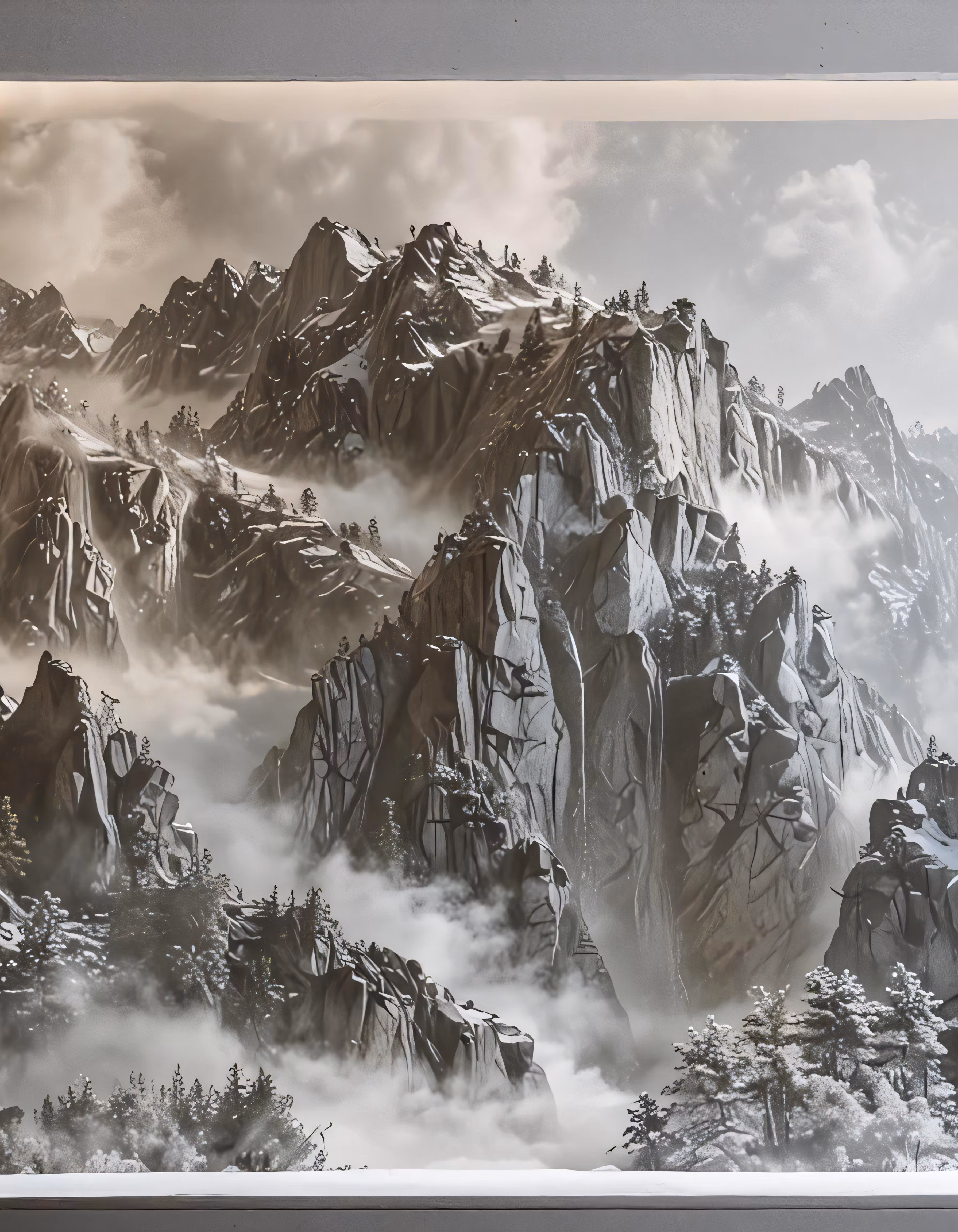 High resolution picture, free to use, a painting with mountains and trees on top of a cloudy hillside
