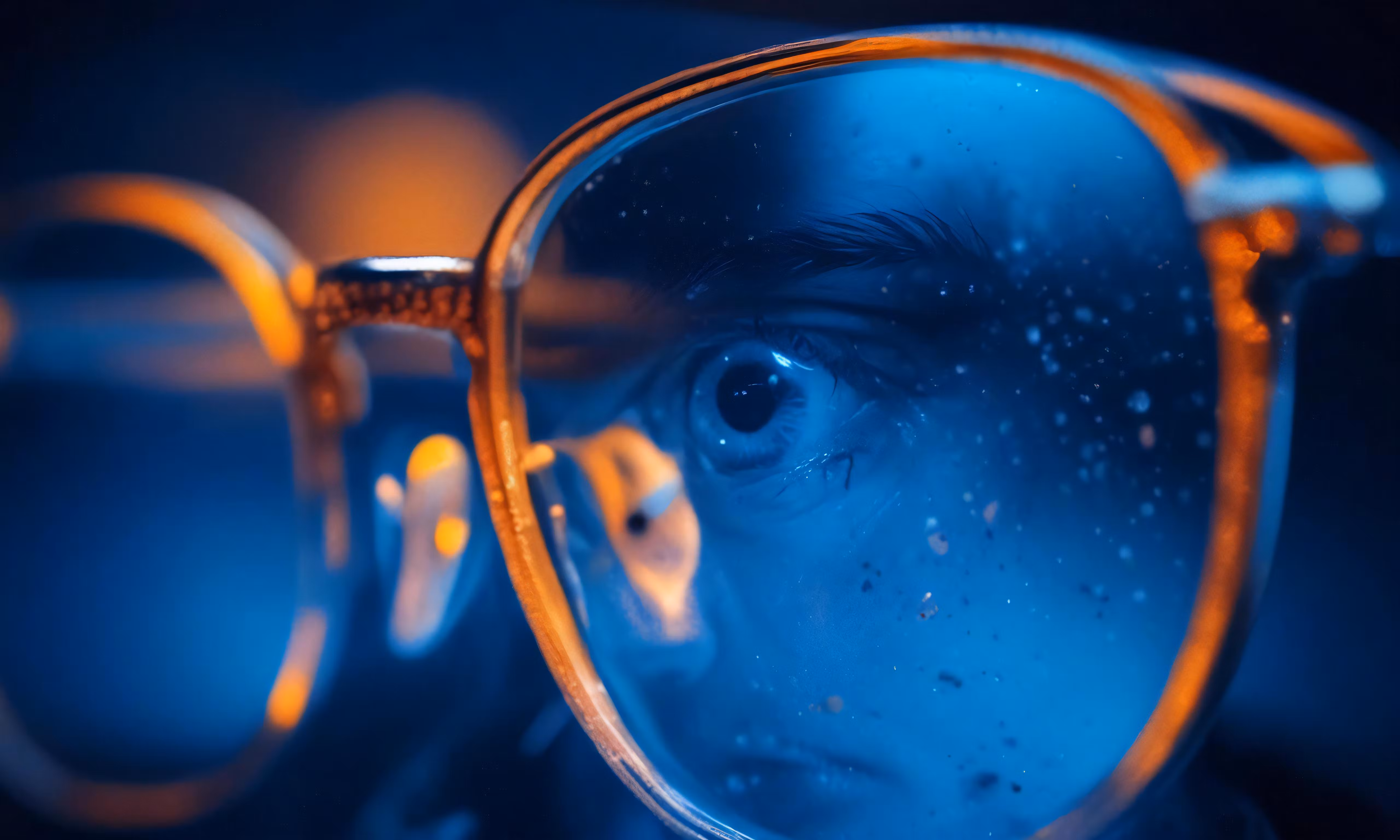 High resolution picture, free to use, a pair of blue lensed glasses with a close up view of the reflection of the lens