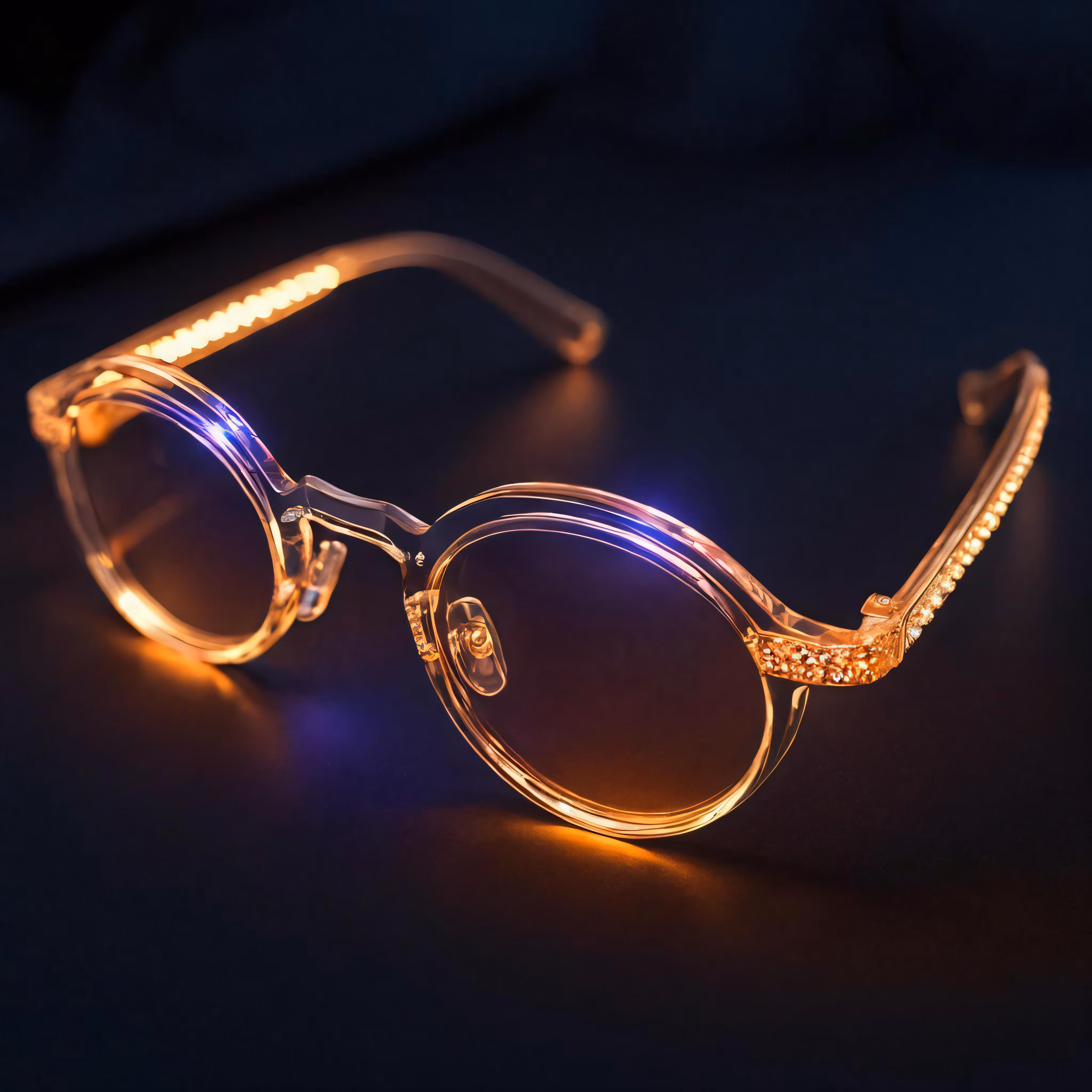 High resolution picture, free to use, a pair of glasses with lights inside are illuminated in the dark