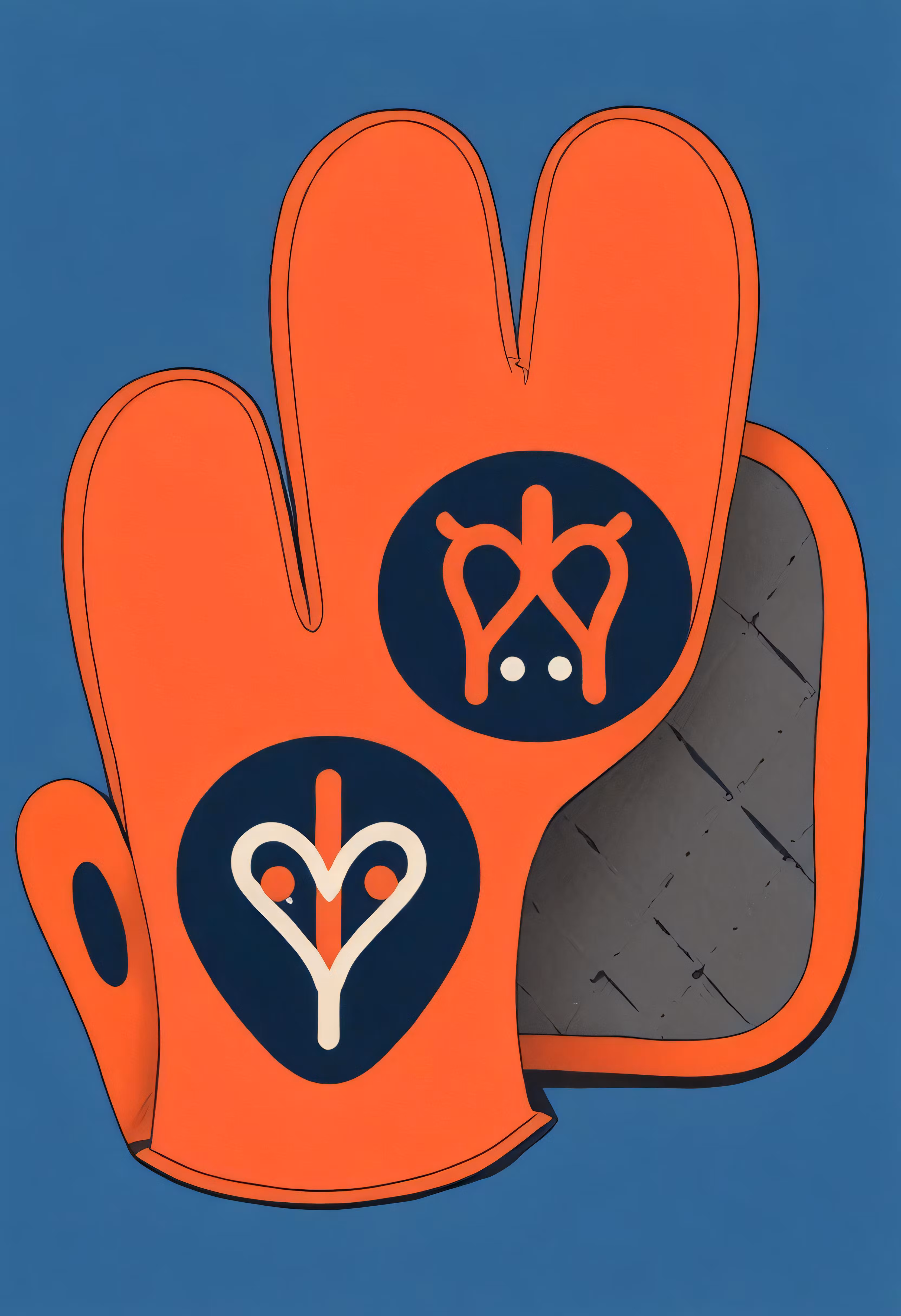 High resolution picture, free to use, a pair of orange oven mitts with blue logo