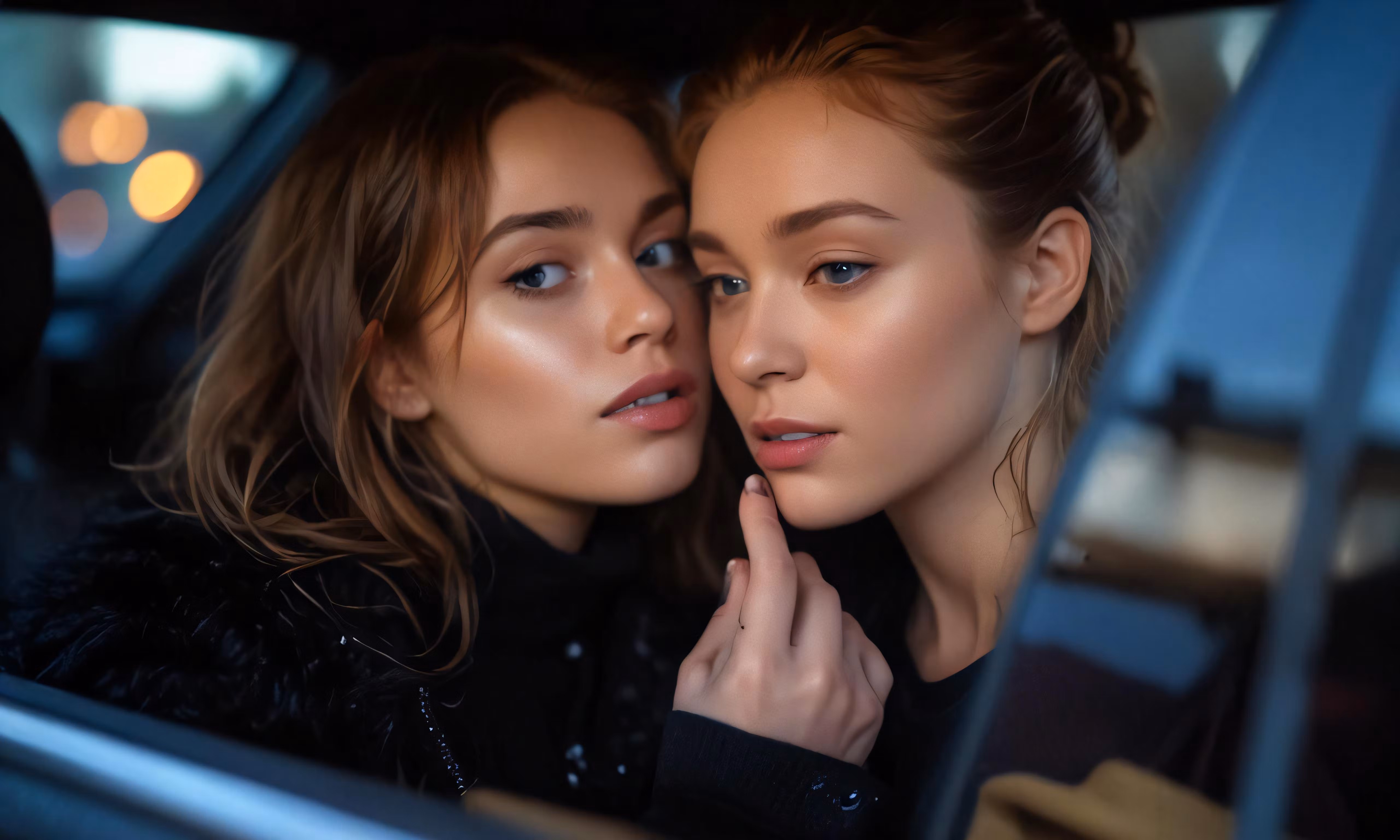 High resolution picture, free to use, a pair of young women in the back seat of a car