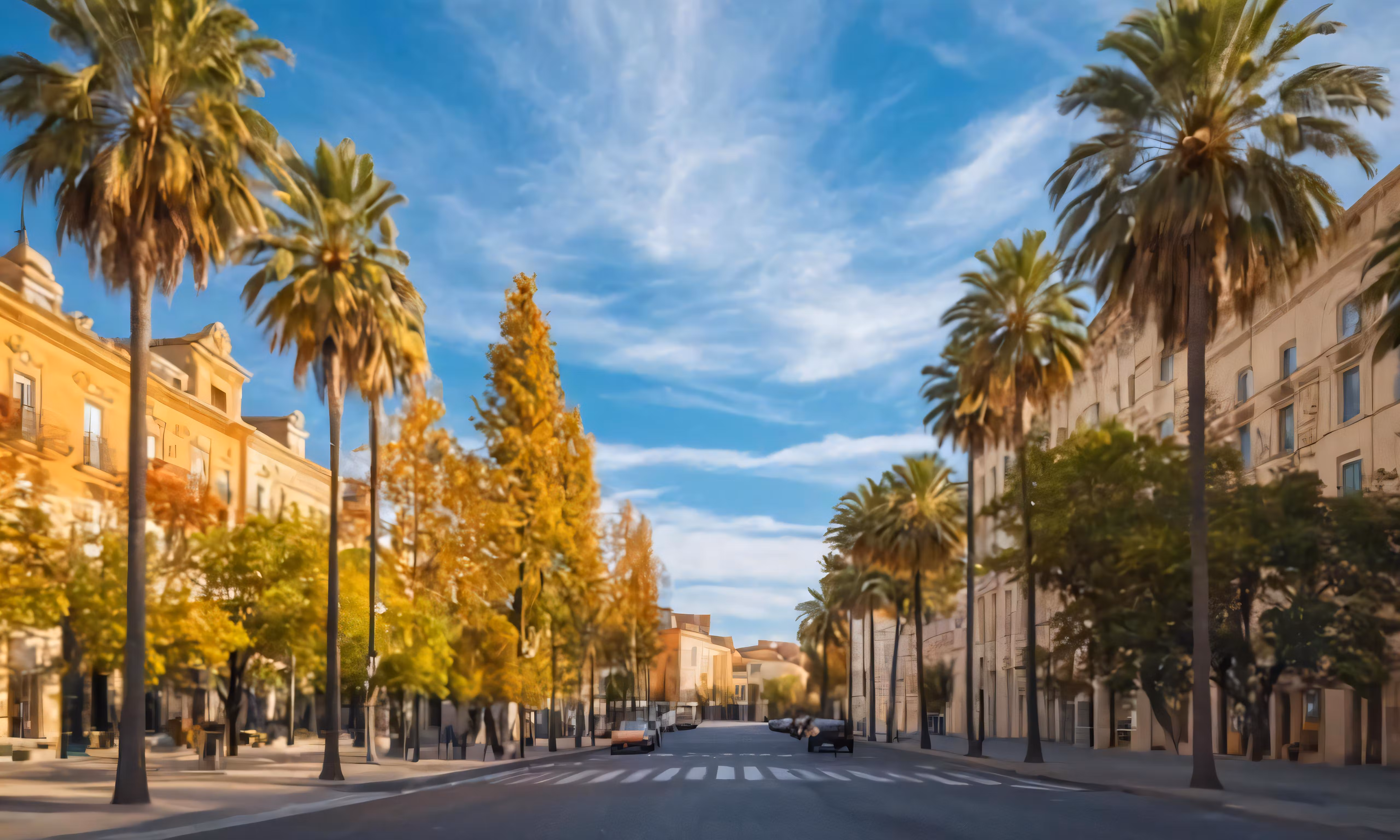 High resolution picture, free to use, a palm tree lined street with lots of traffic