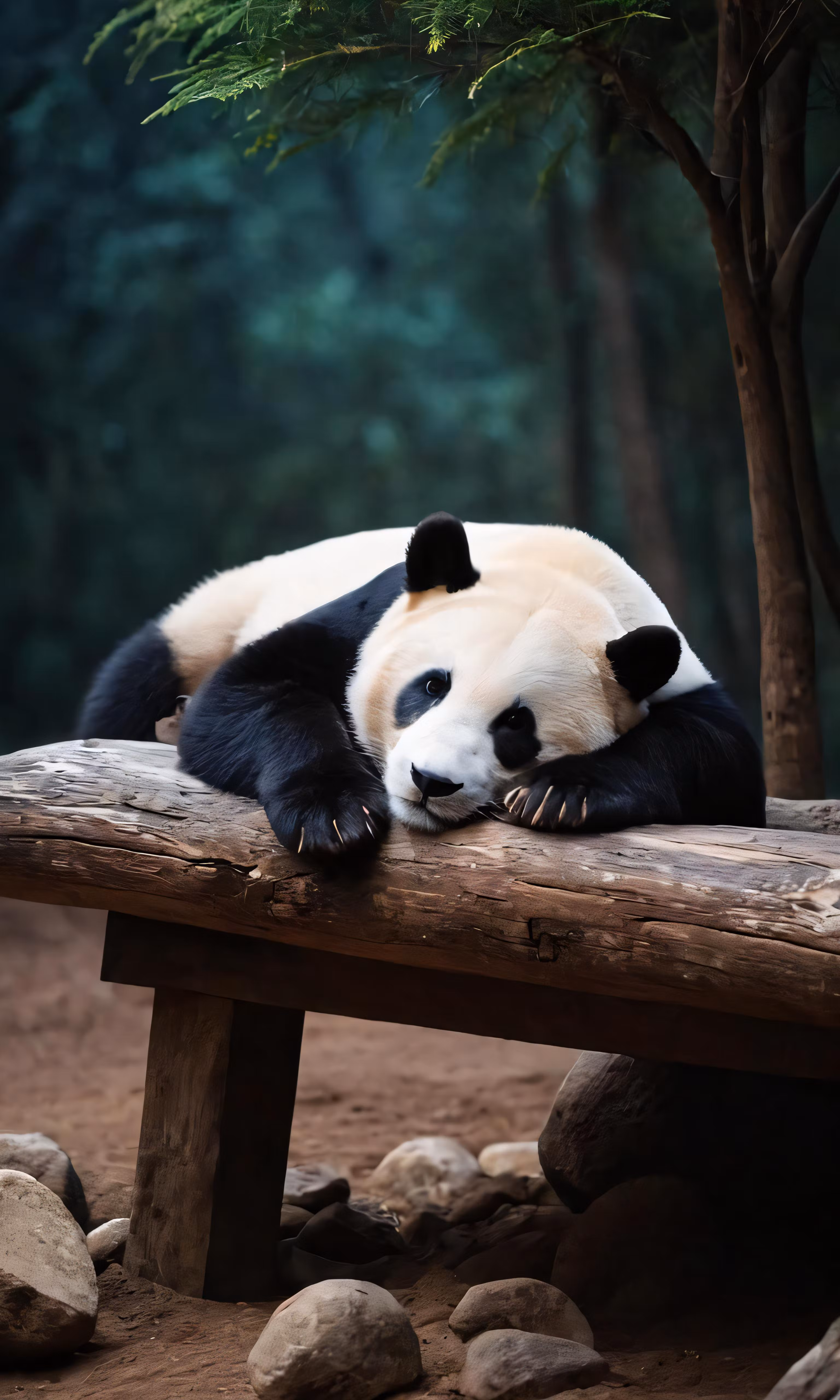 High resolution picture, free to use, a panda bear sitting on top of a bench