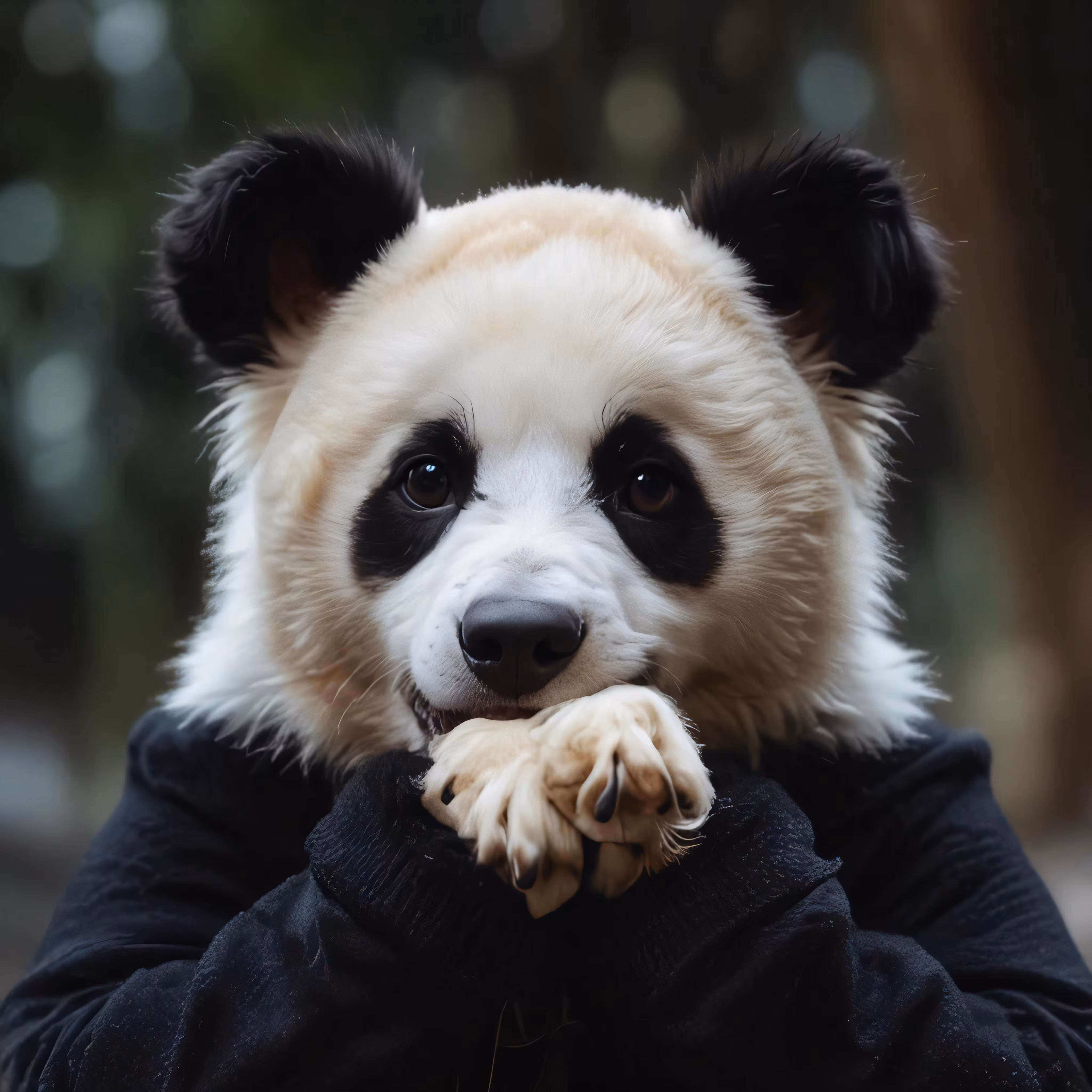 High resolution picture, free to use, a panda bear with a stuffed animal in his lap