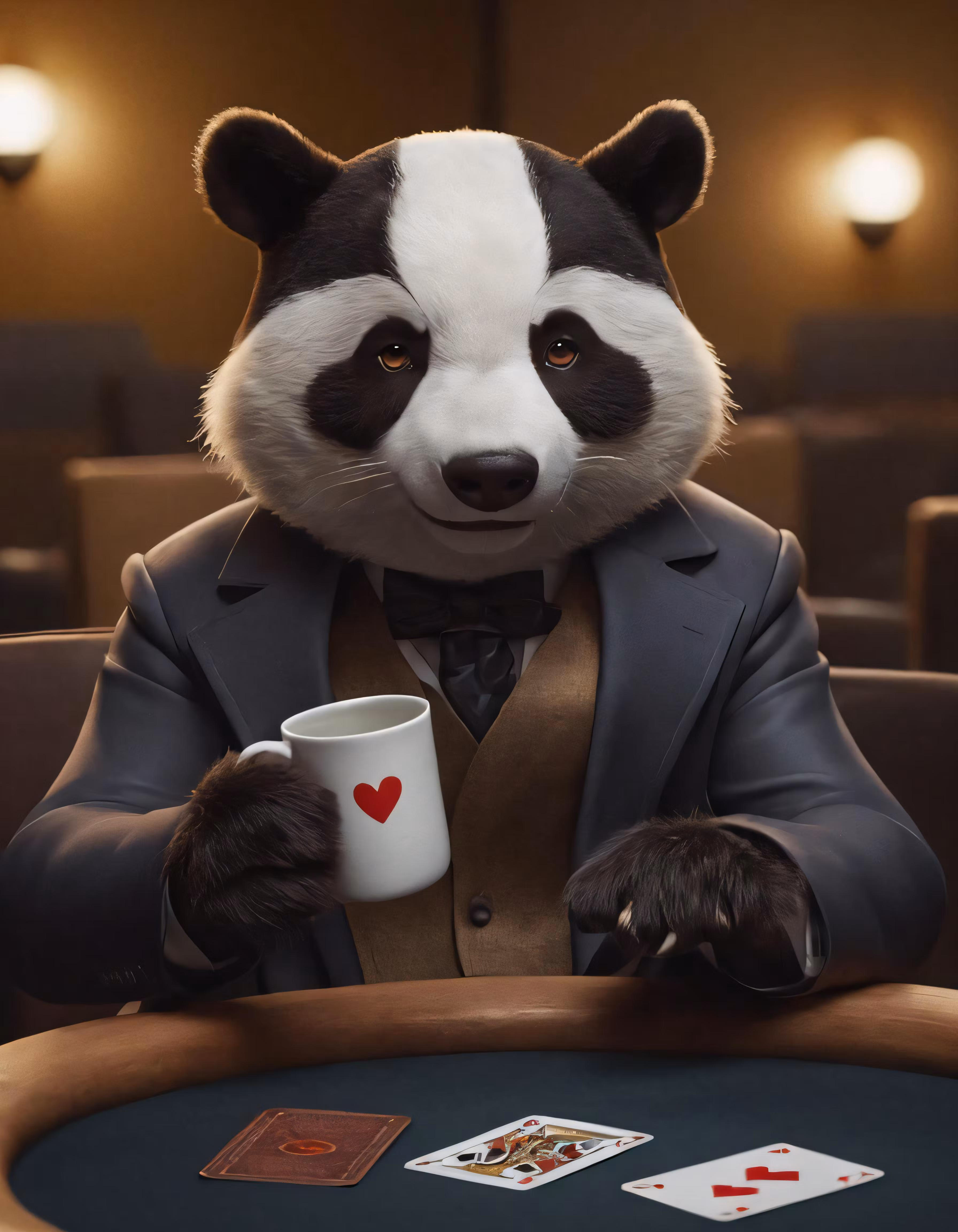 High resolution picture, free to use, a panda dressed in a suit sitting at a poker table