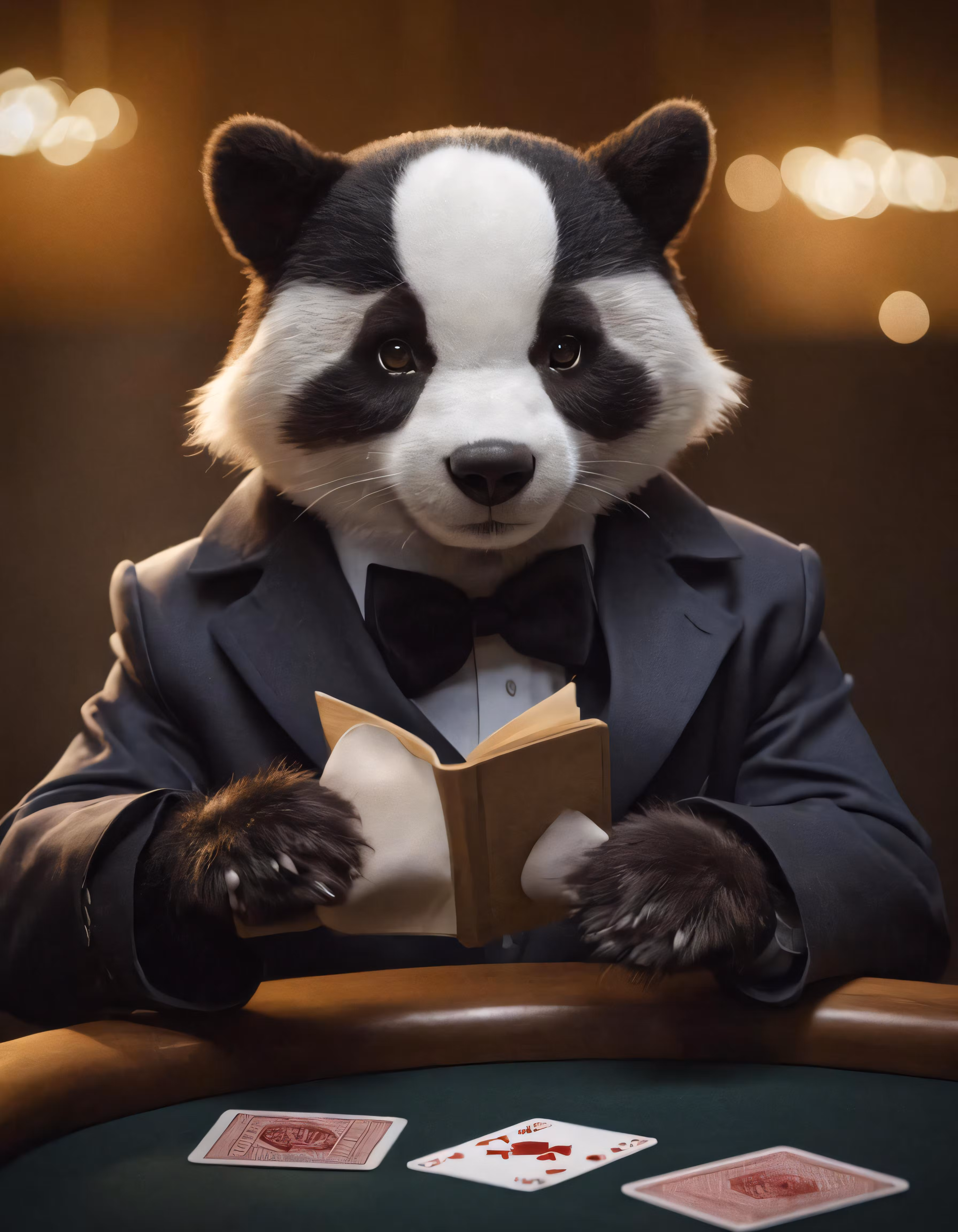 High resolution picture, free to use, a panda holding a card and a book