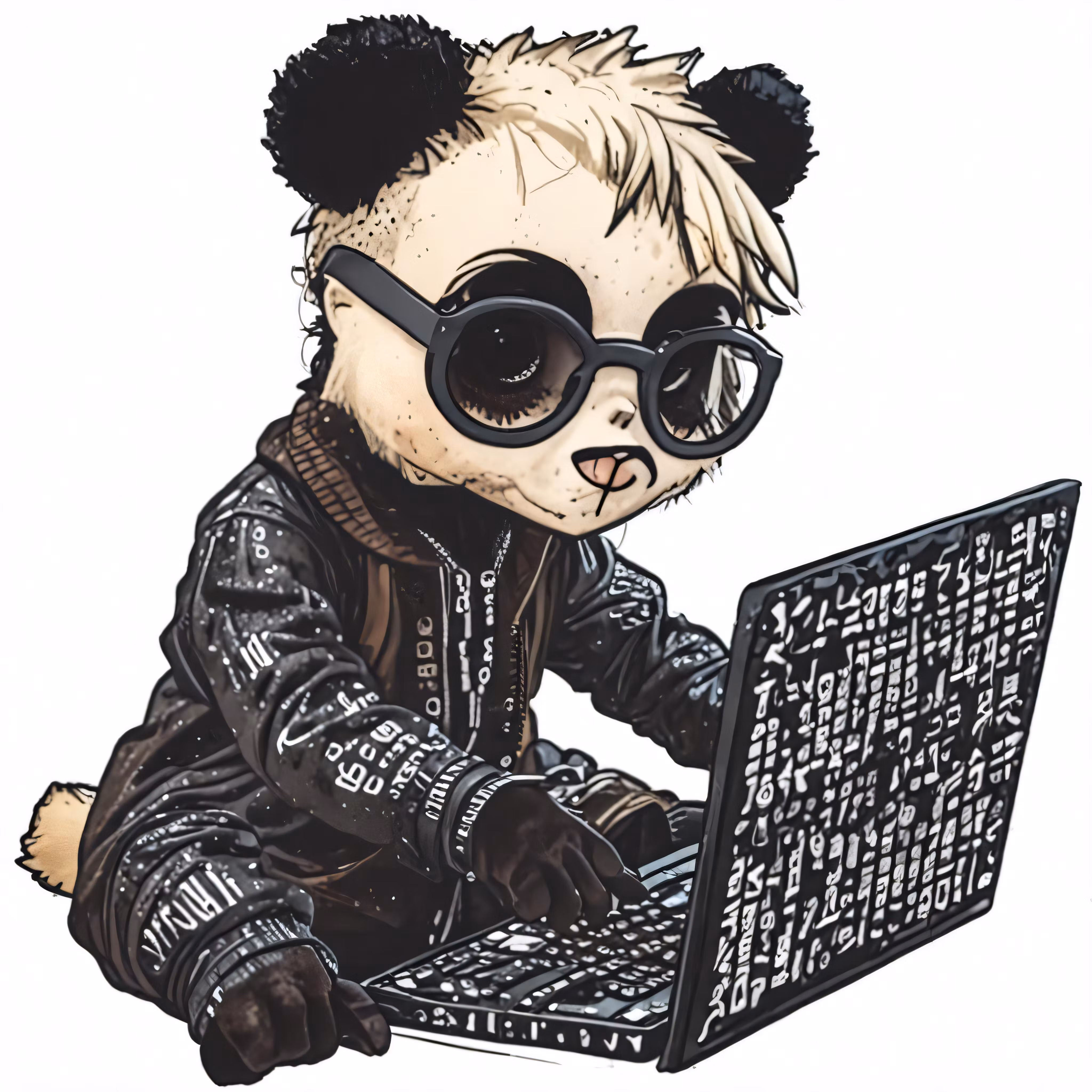 High resolution picture, free to use, a panda wearing a leather jacket and sunglasses sitting in front of a laptop