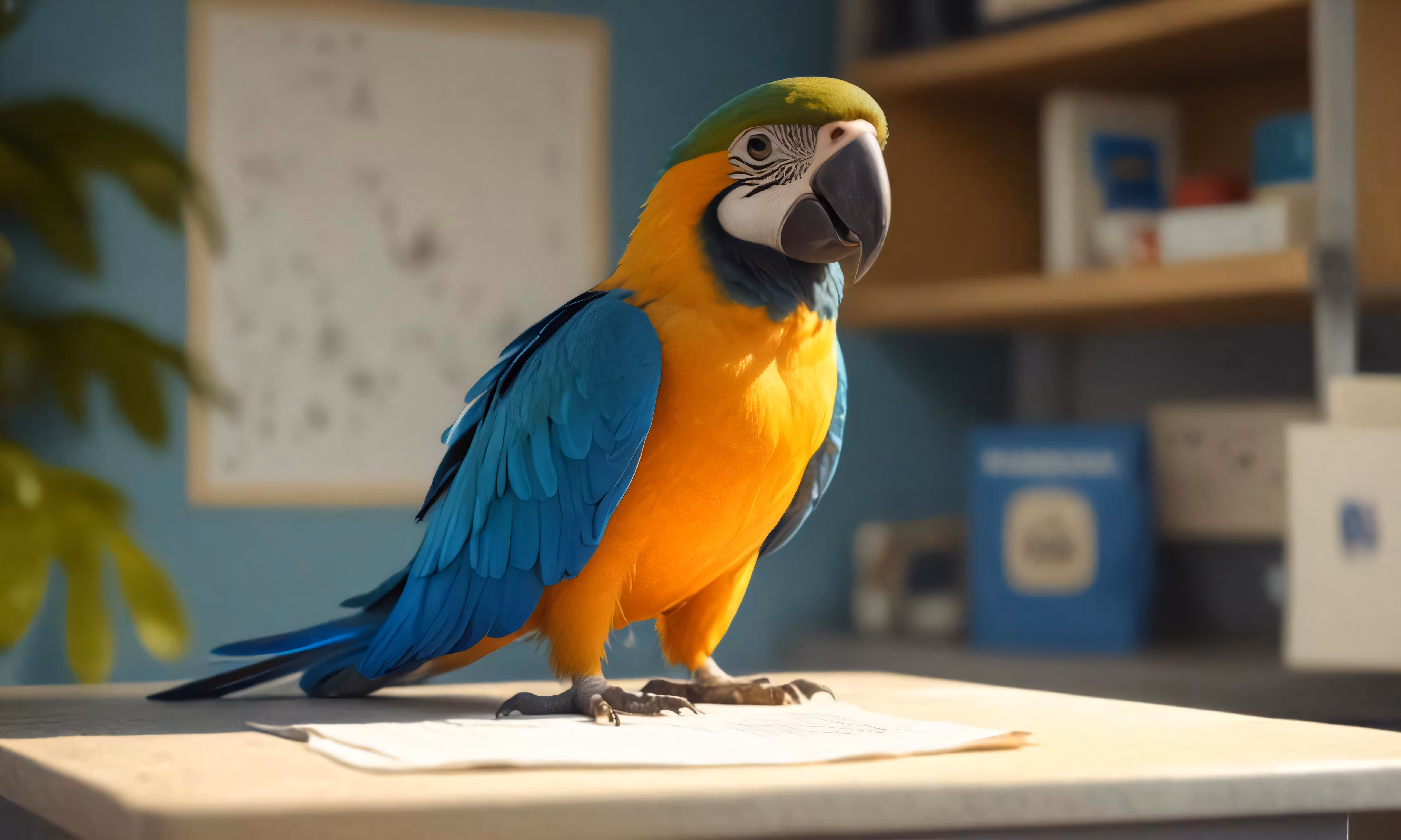 High resolution picture, free to use, a parrot with colorful feathers is standing on the edge of a desk