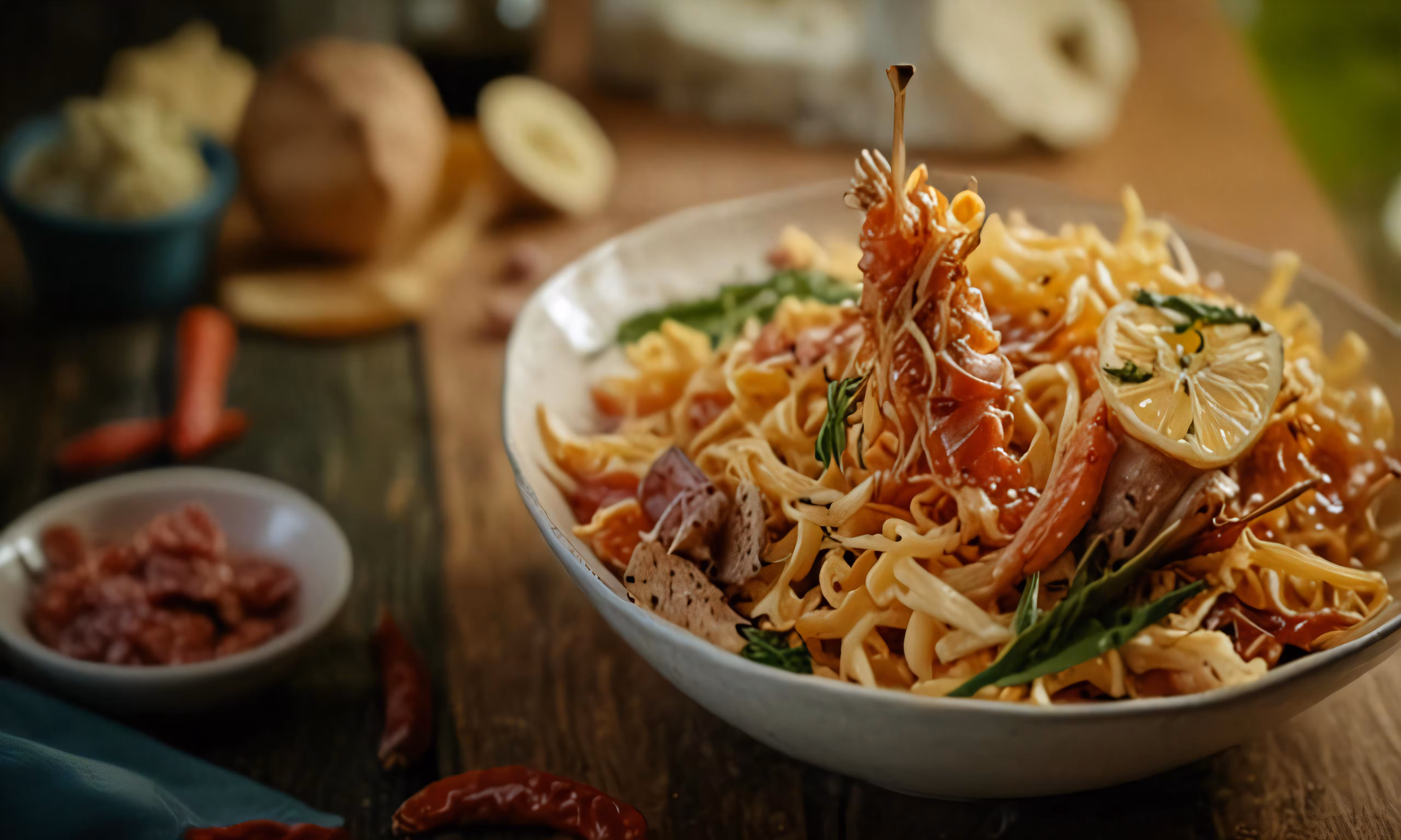 High resolution picture, free to use, a pasta dish with seafood on top and other vegetables