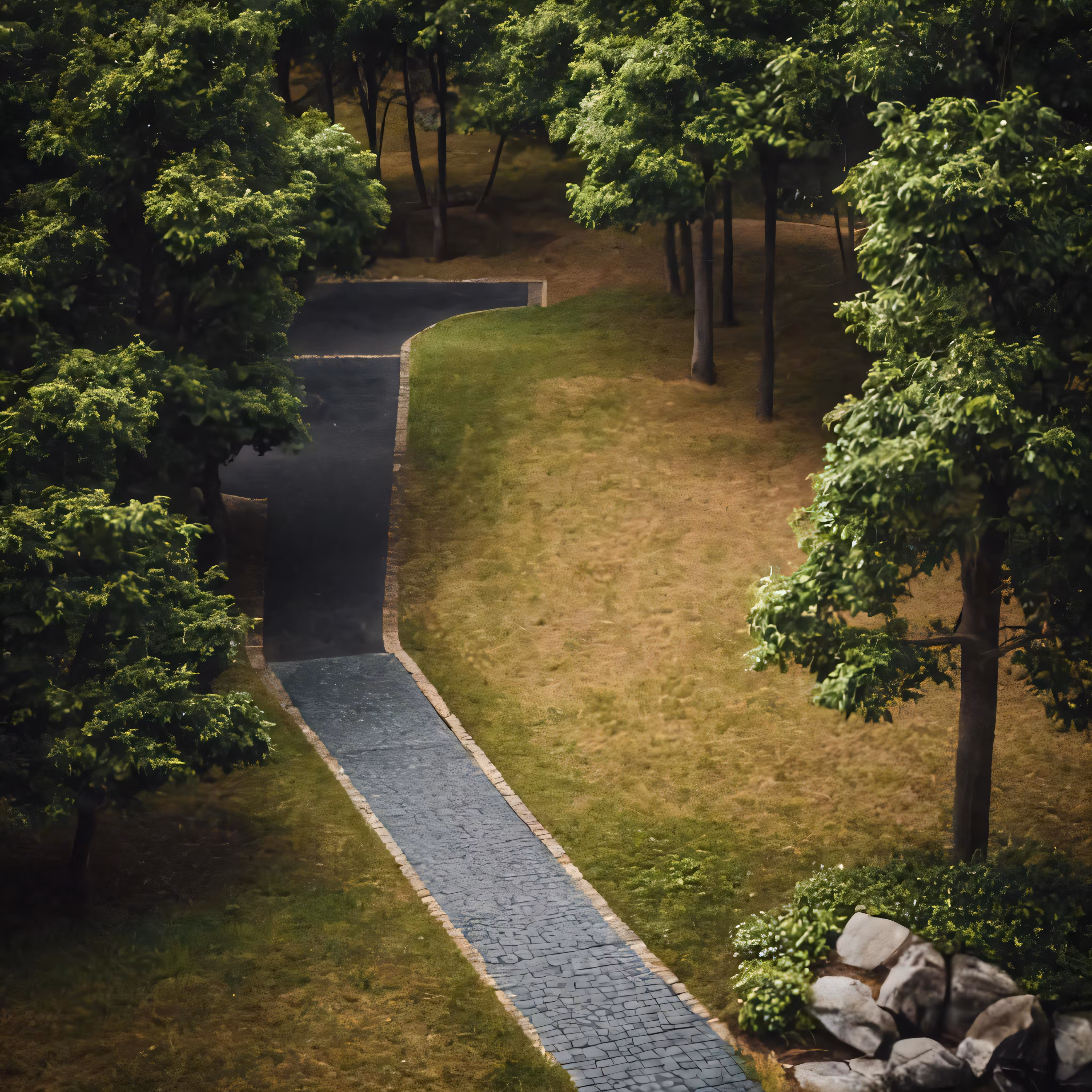 High resolution picture, free to use, a pathway between two trees lined with stones