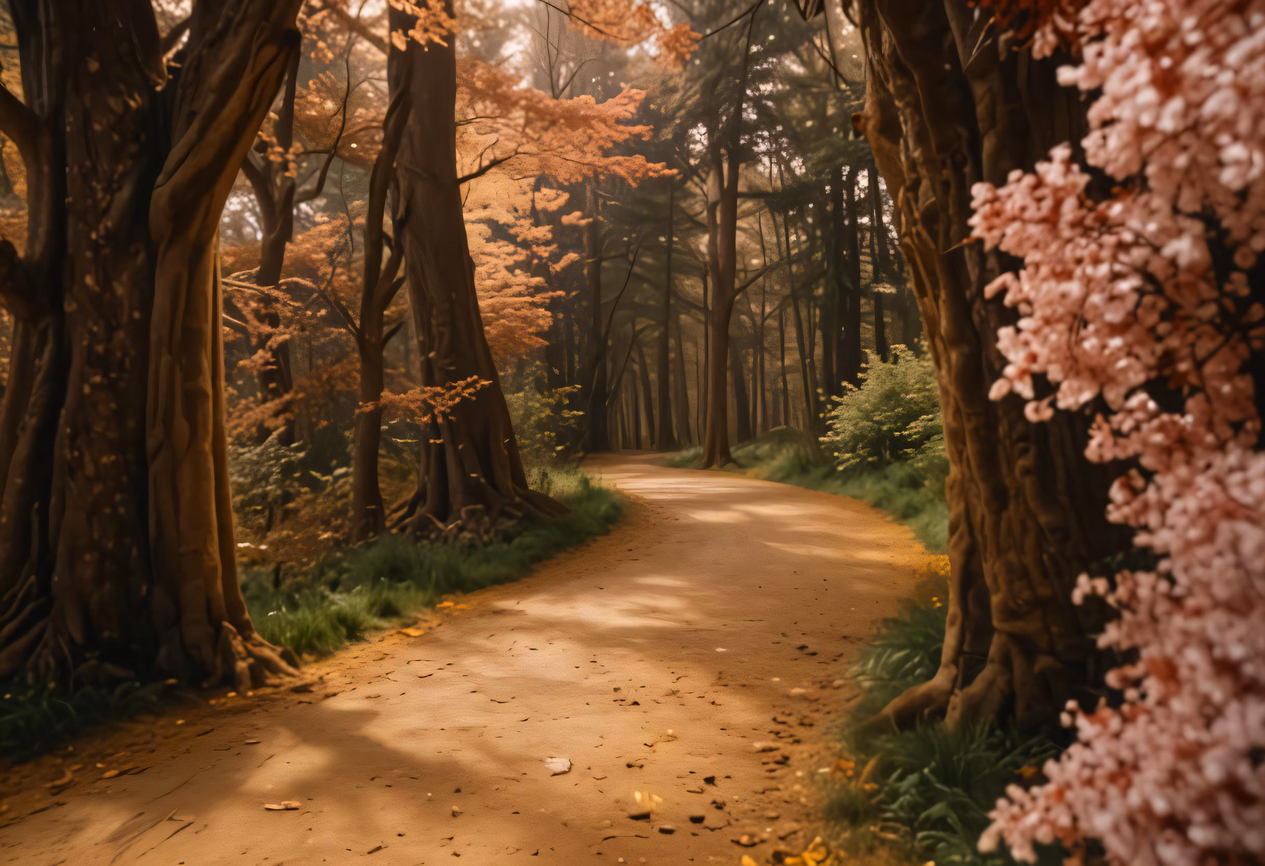High resolution picture, free to use, a pathway leading through the woods near trees