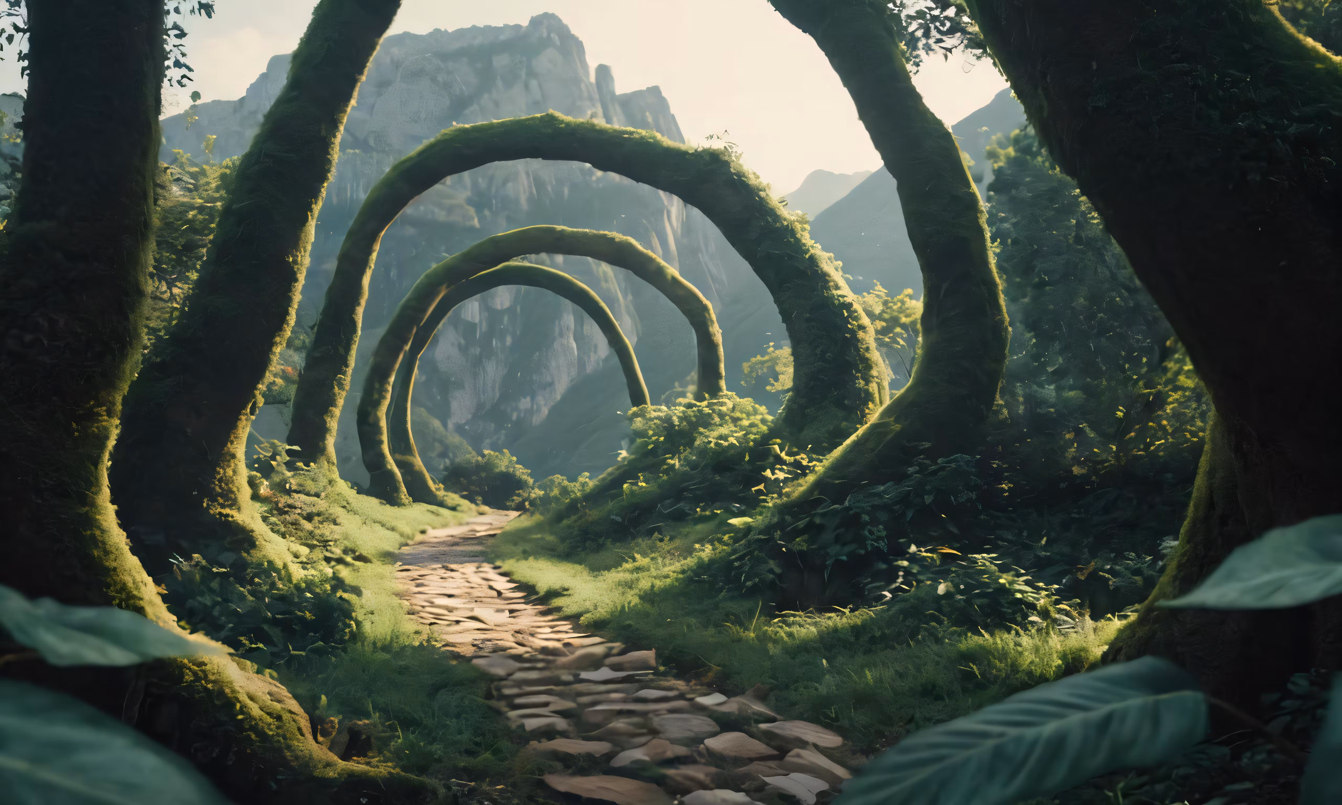 High resolution picture, free to use, a pathway leading through trees into the mountains