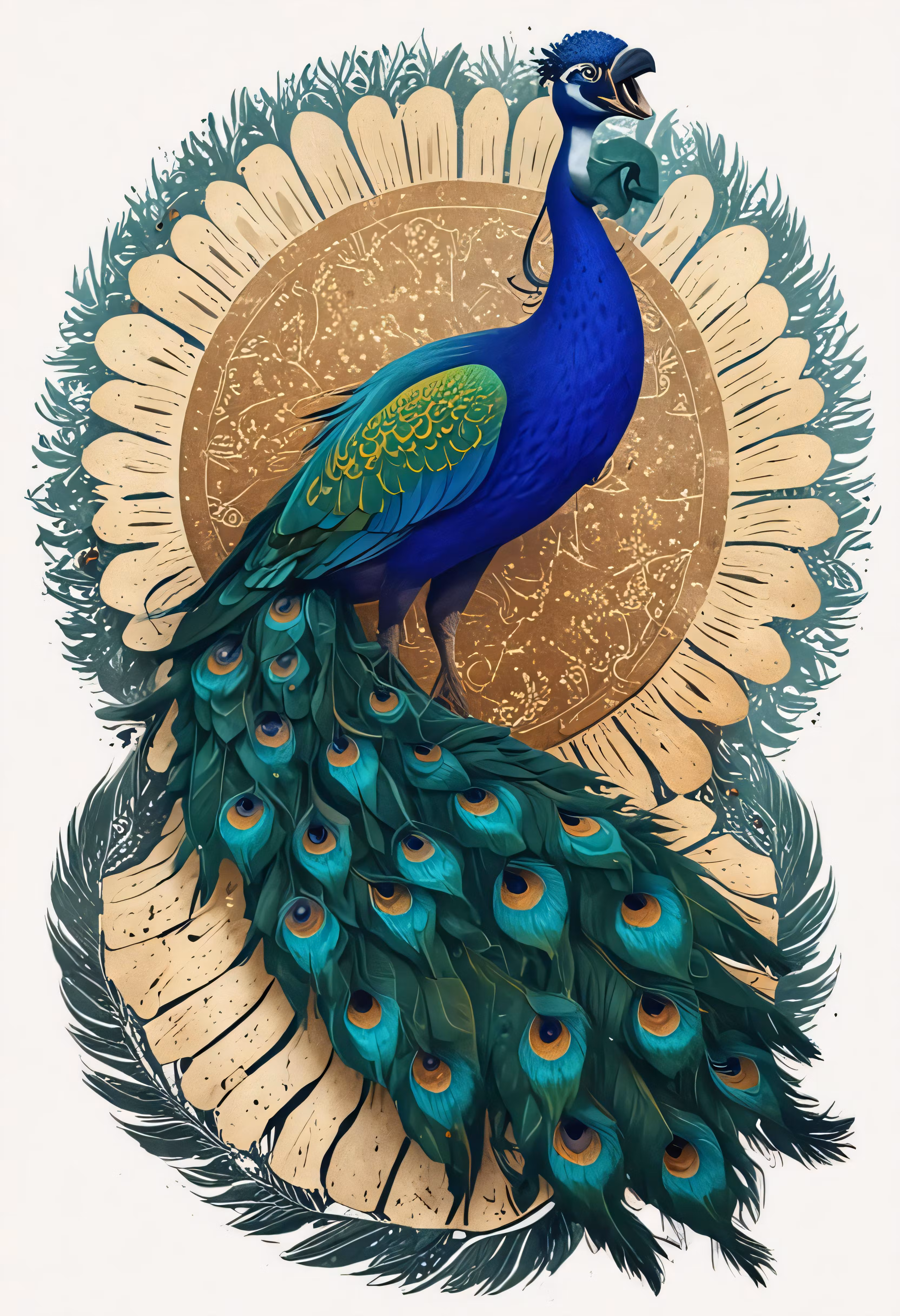 High resolution picture, free to use, a peacock with feathers on top of a gold plate