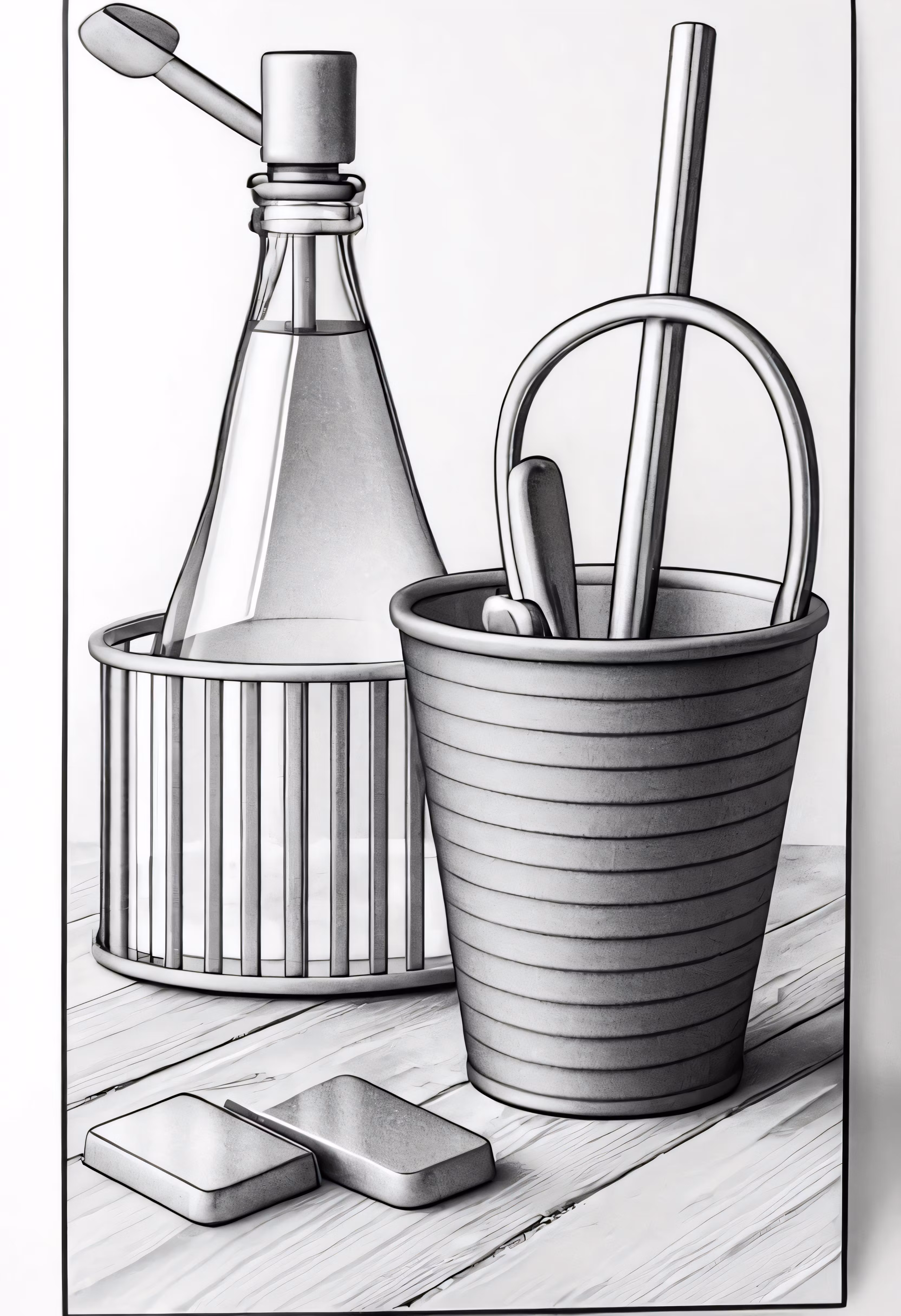 High resolution picture, free to use, a pen and pencil drawing of some stuff in a bucket
