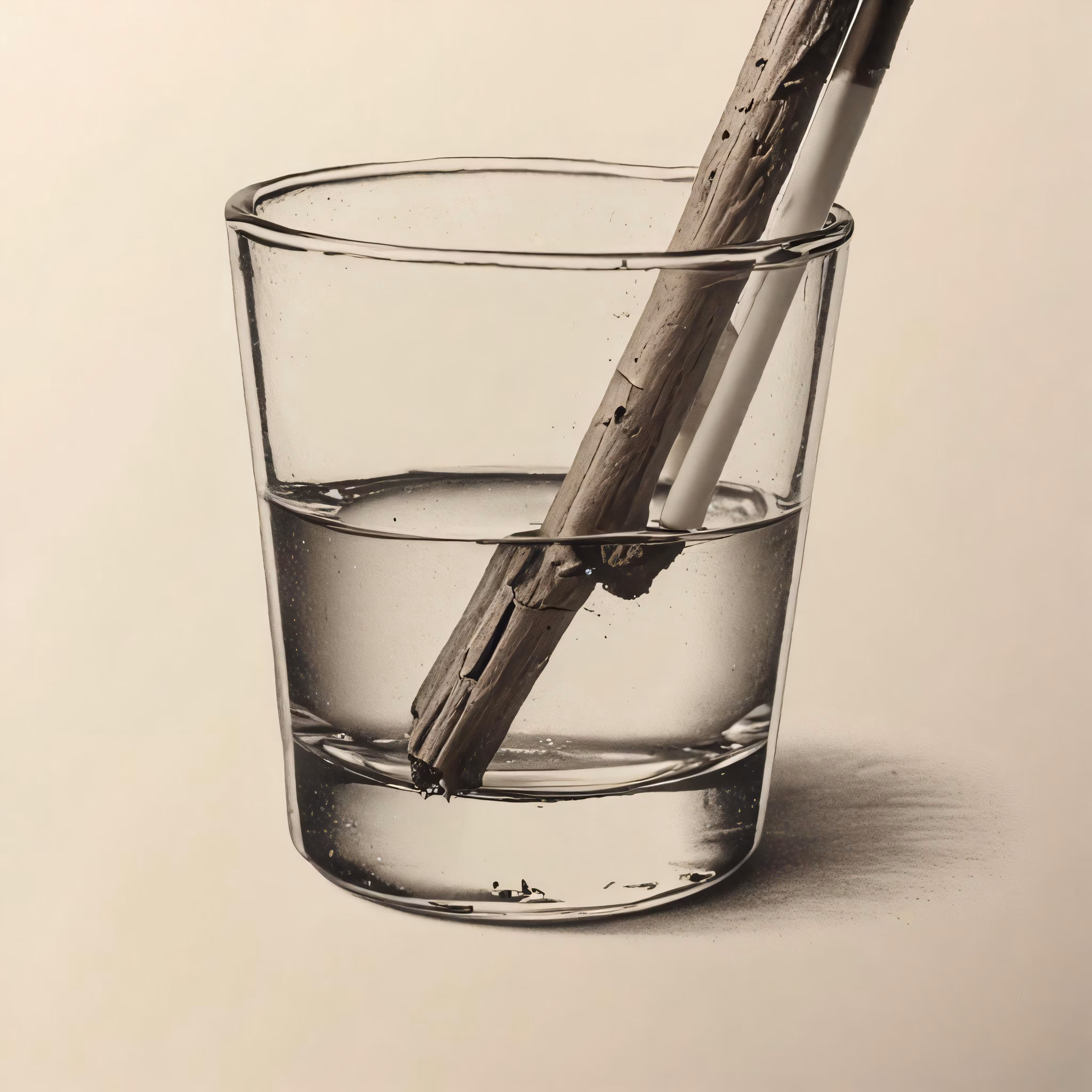 High resolution picture, free to use, a pencil drawing of a glass with water and an old wooden stick sticking out