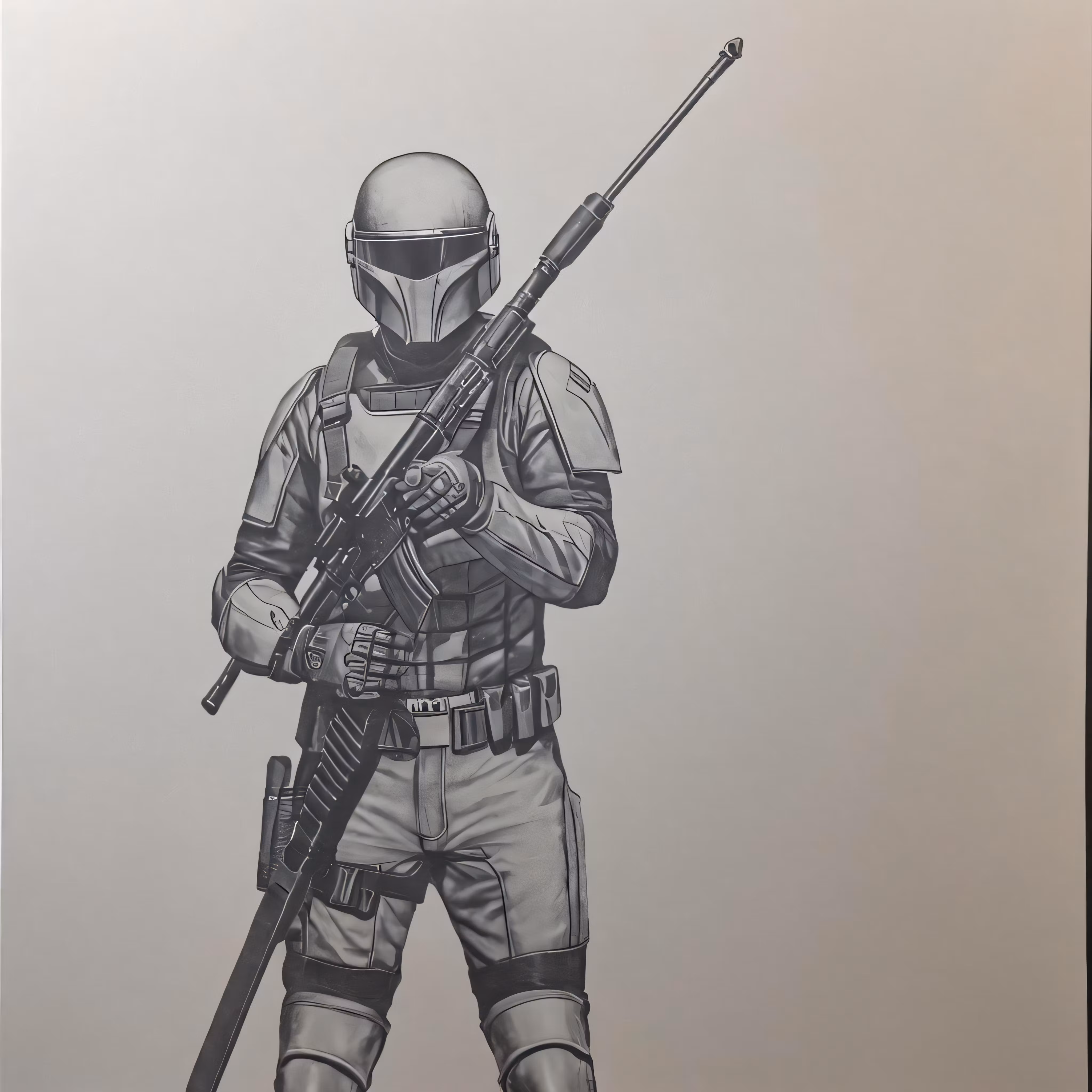 High resolution picture, free to use, a pencil drawing of a man in military clothing holding a gun