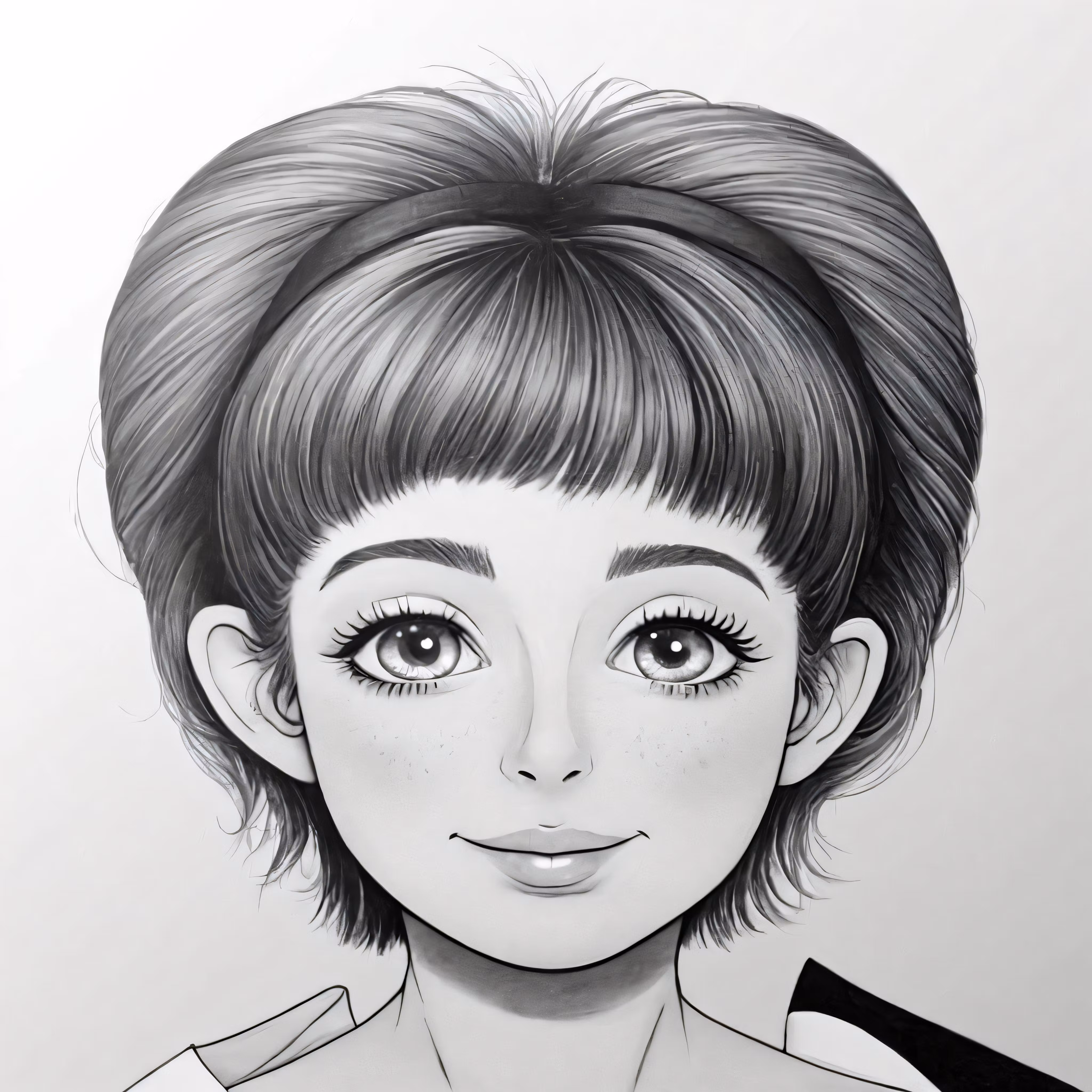 High resolution picture, free to use, a pencil drawing of a young girl with bangs and a collar