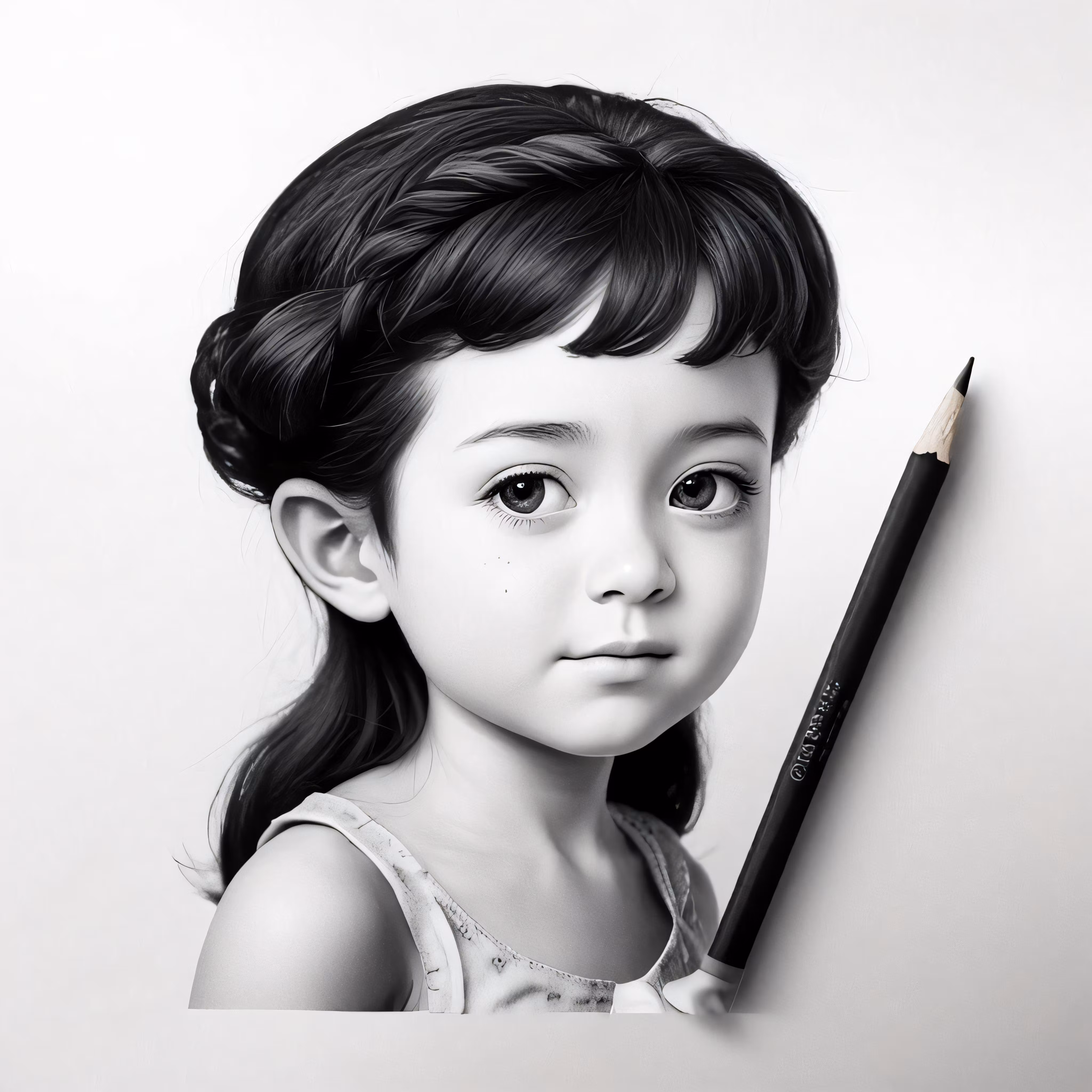 High resolution picture, free to use, a pencil is sitting next to a drawing of a young girl