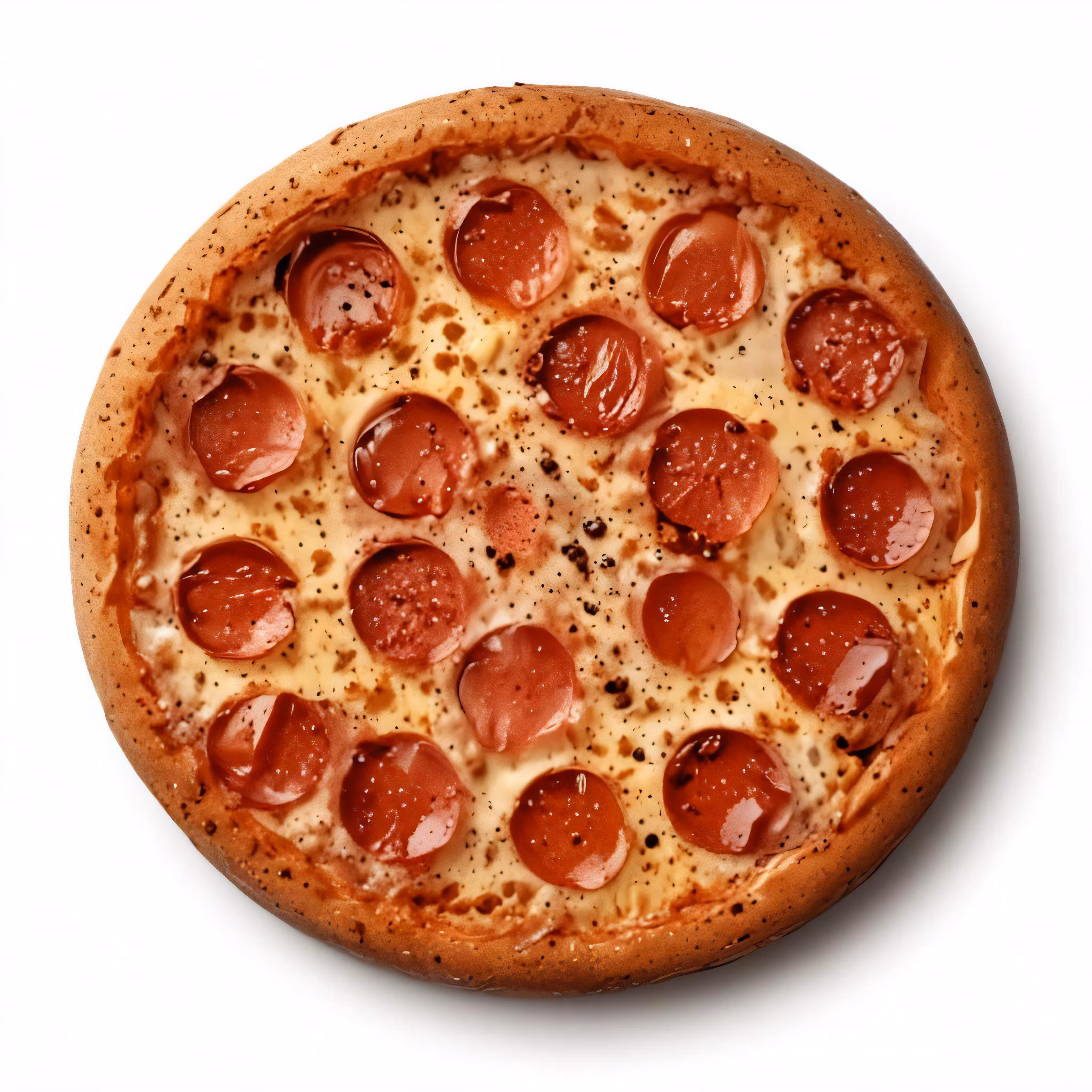 High resolution picture, free to use, a pepperoni pizza is displayed on a white background