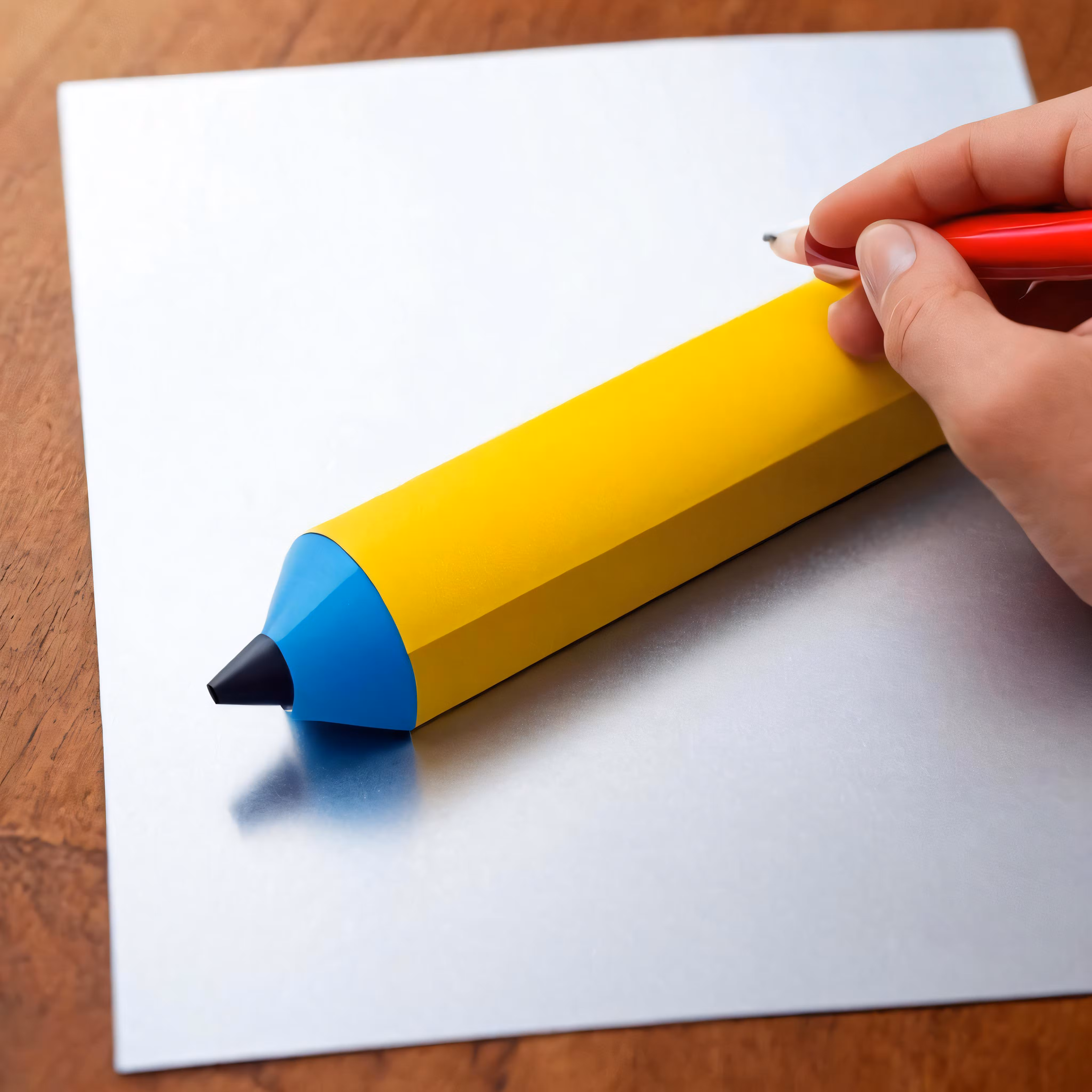 High resolution picture, free to use, a person draws on a yellow piece of paper with blue and yellow pencils
