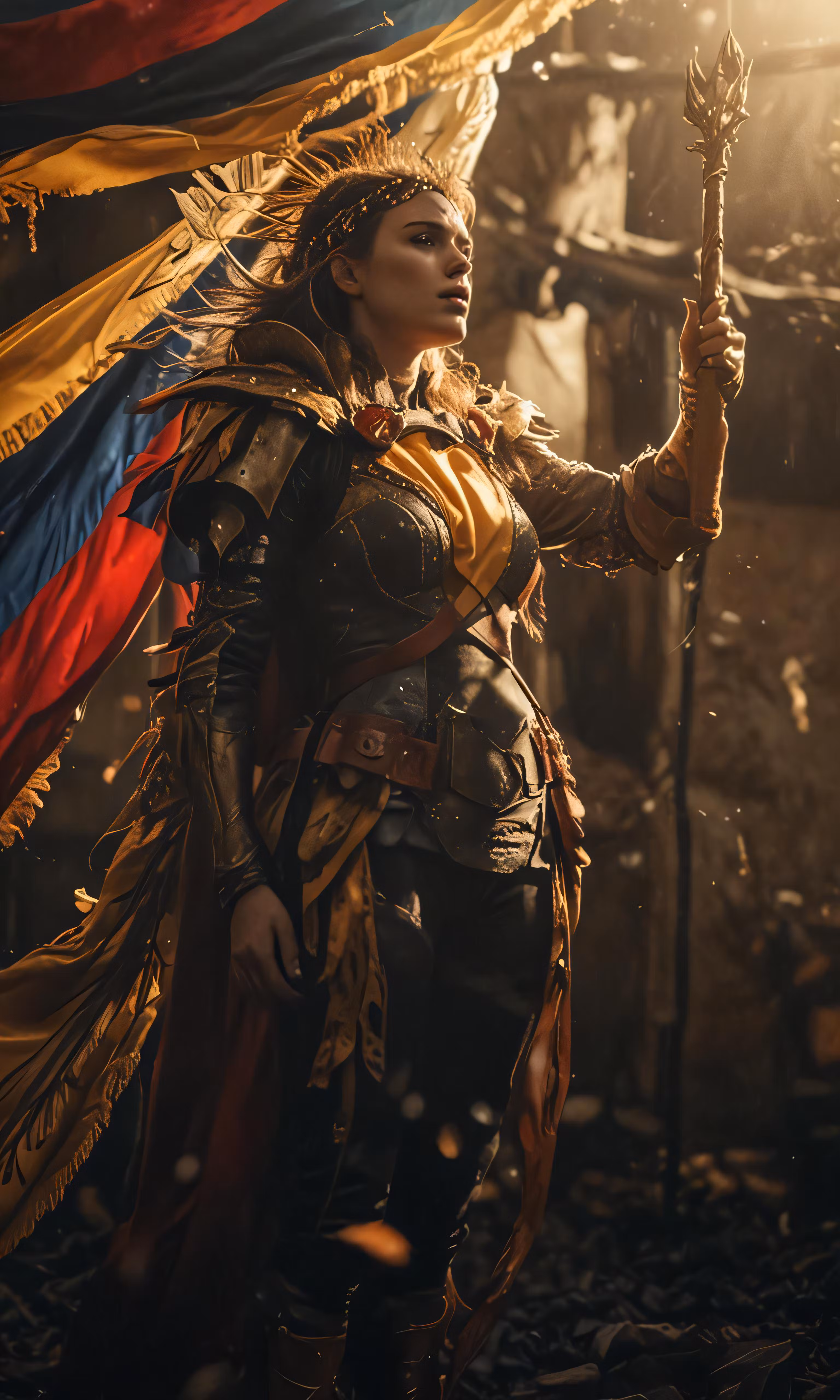 High resolution picture, free to use, a person dressed as a warrior holding a sword and a flag
