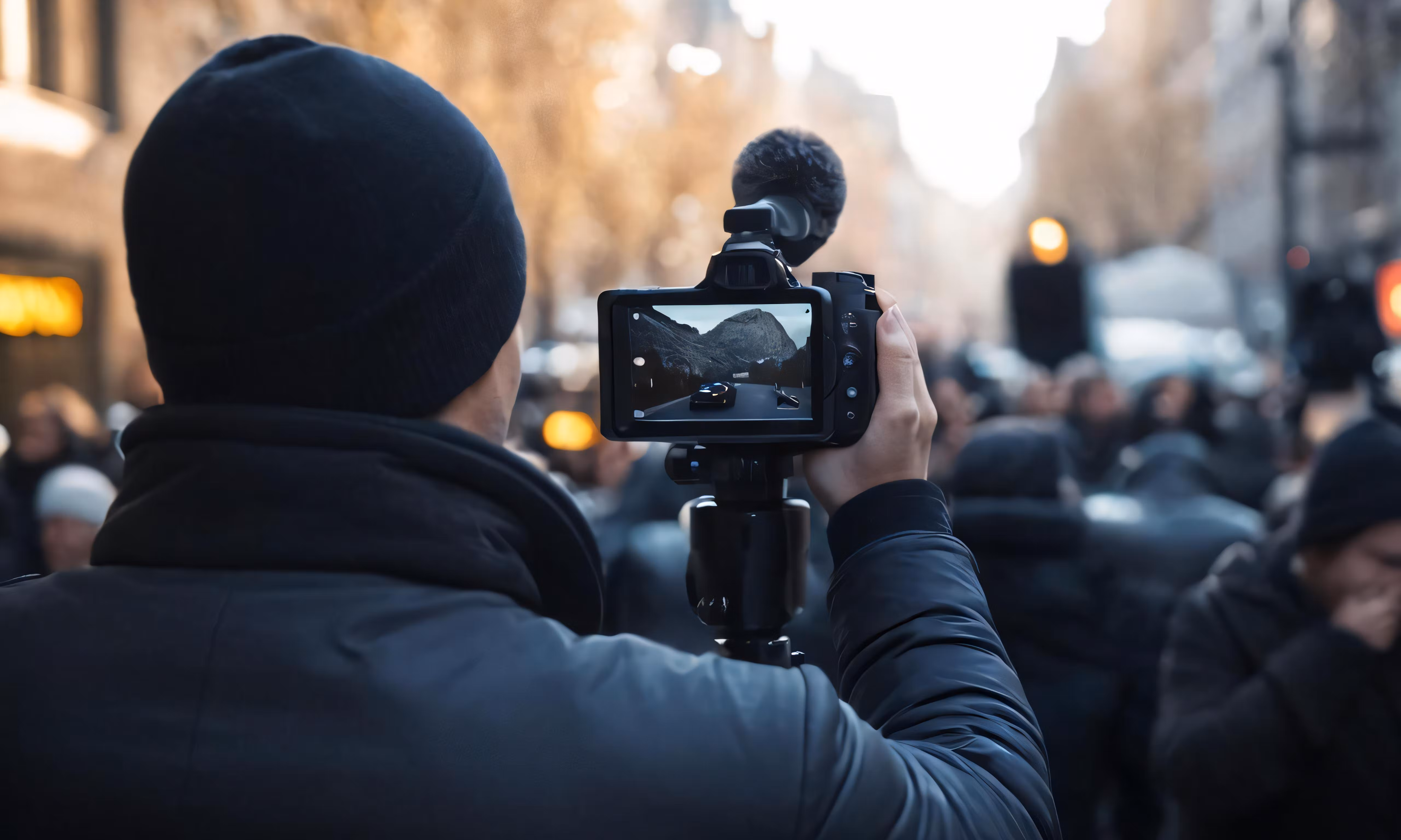 High resolution picture, free to use, a person filming a demonstration for a street show