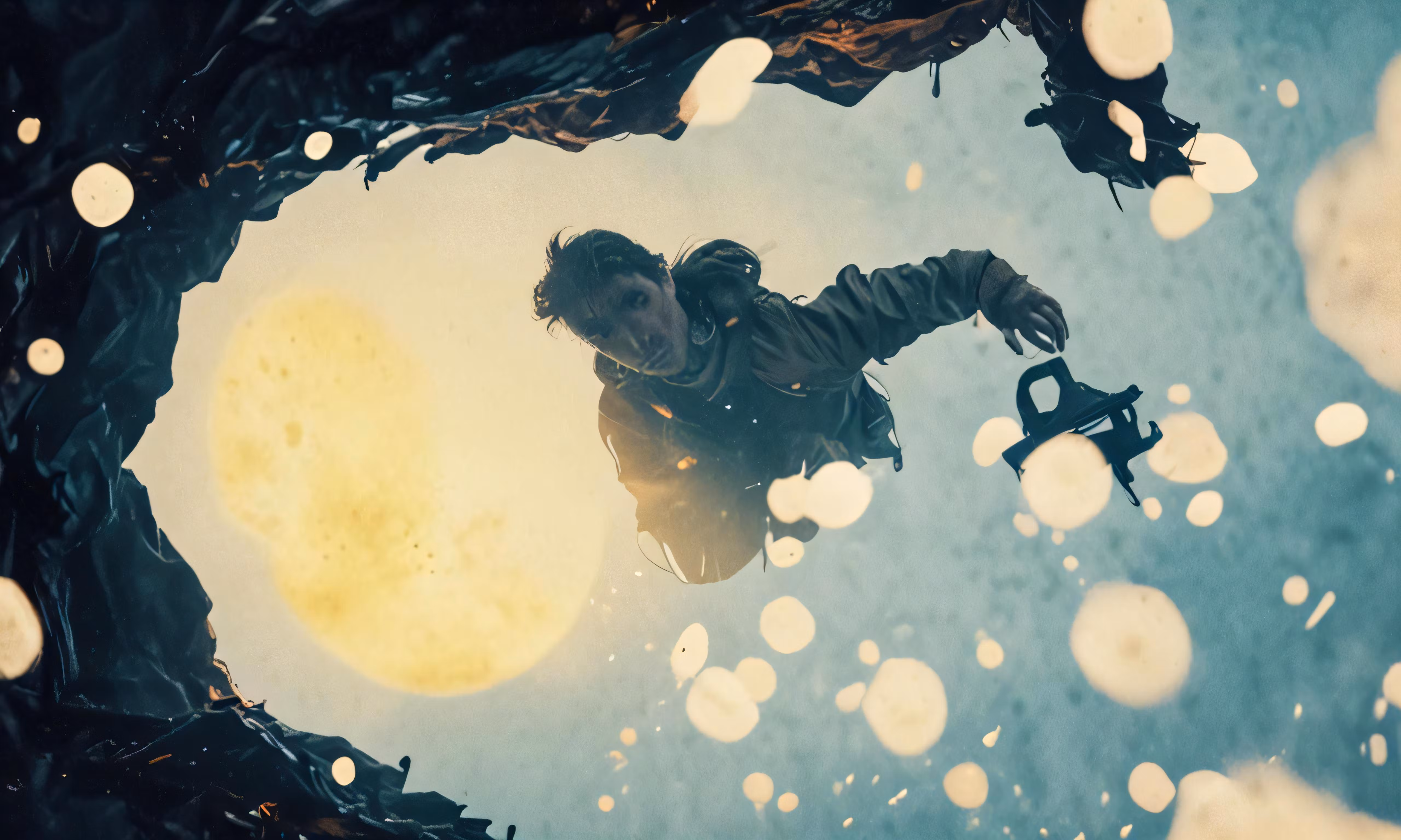 High resolution picture, free to use, a person floating through the water in front of a large moon