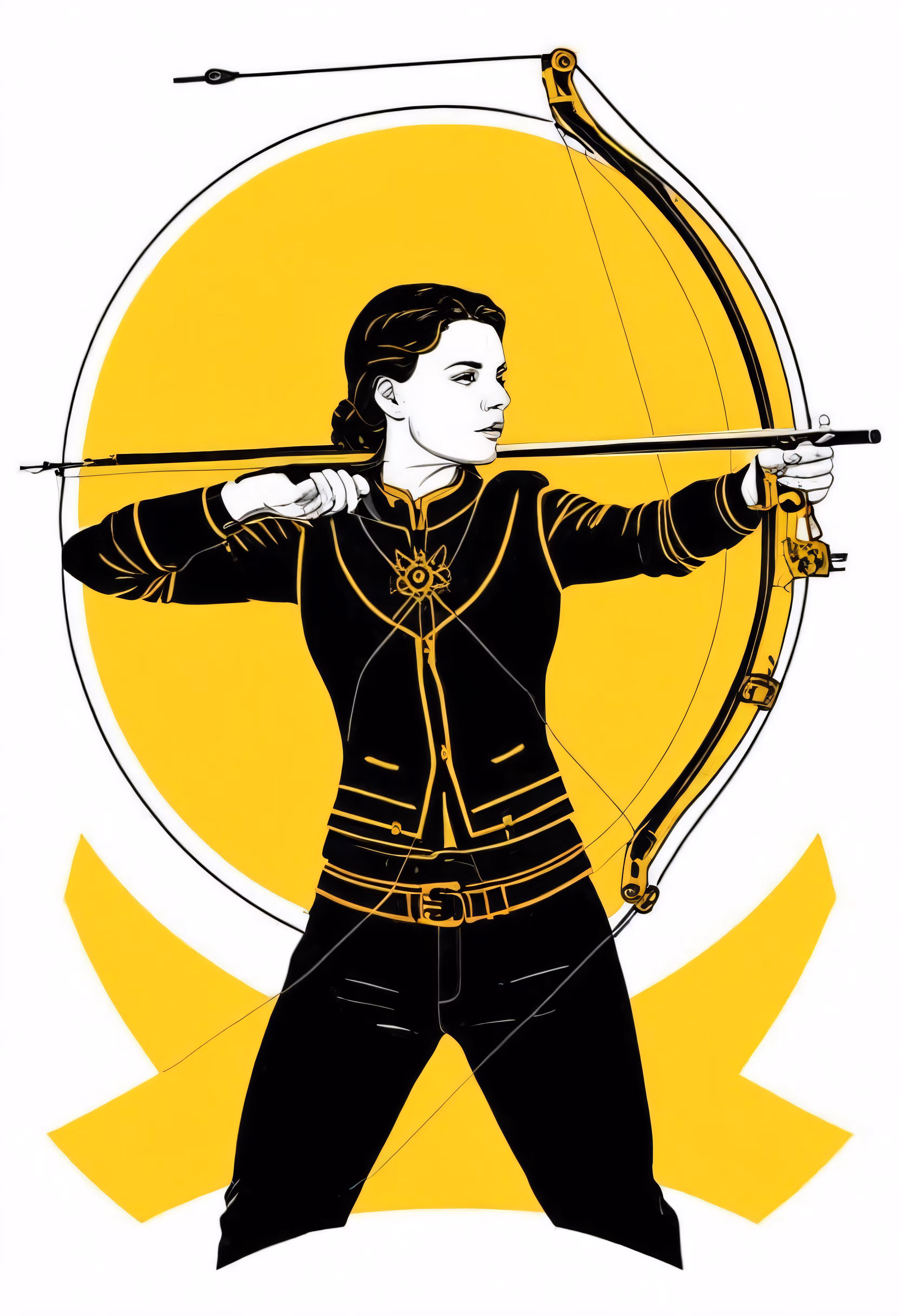 High resolution picture, free to use, a person holding a bow and arrow in front of a yellow sun