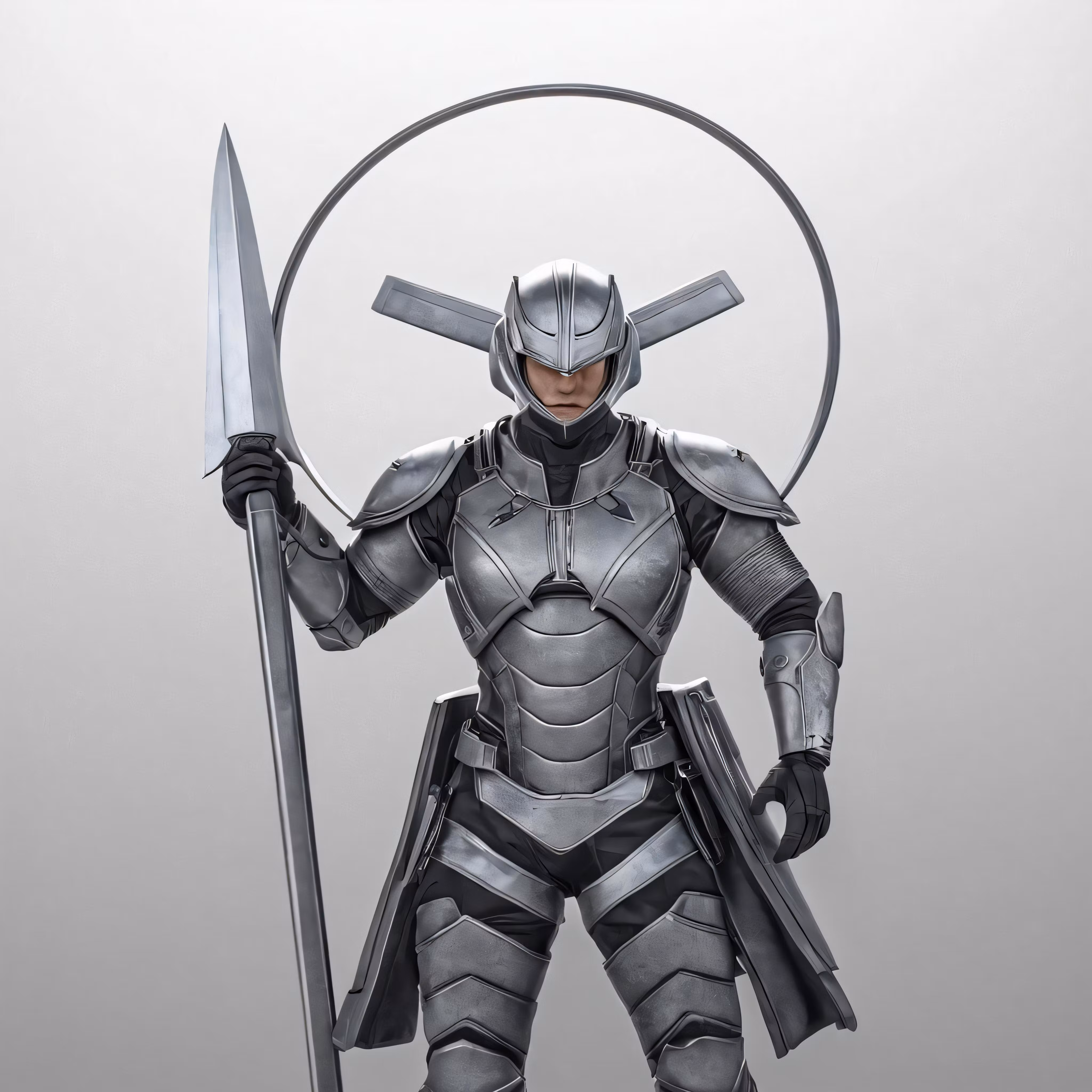 High resolution picture, free to use, a person holding a giant sword and a large circular object