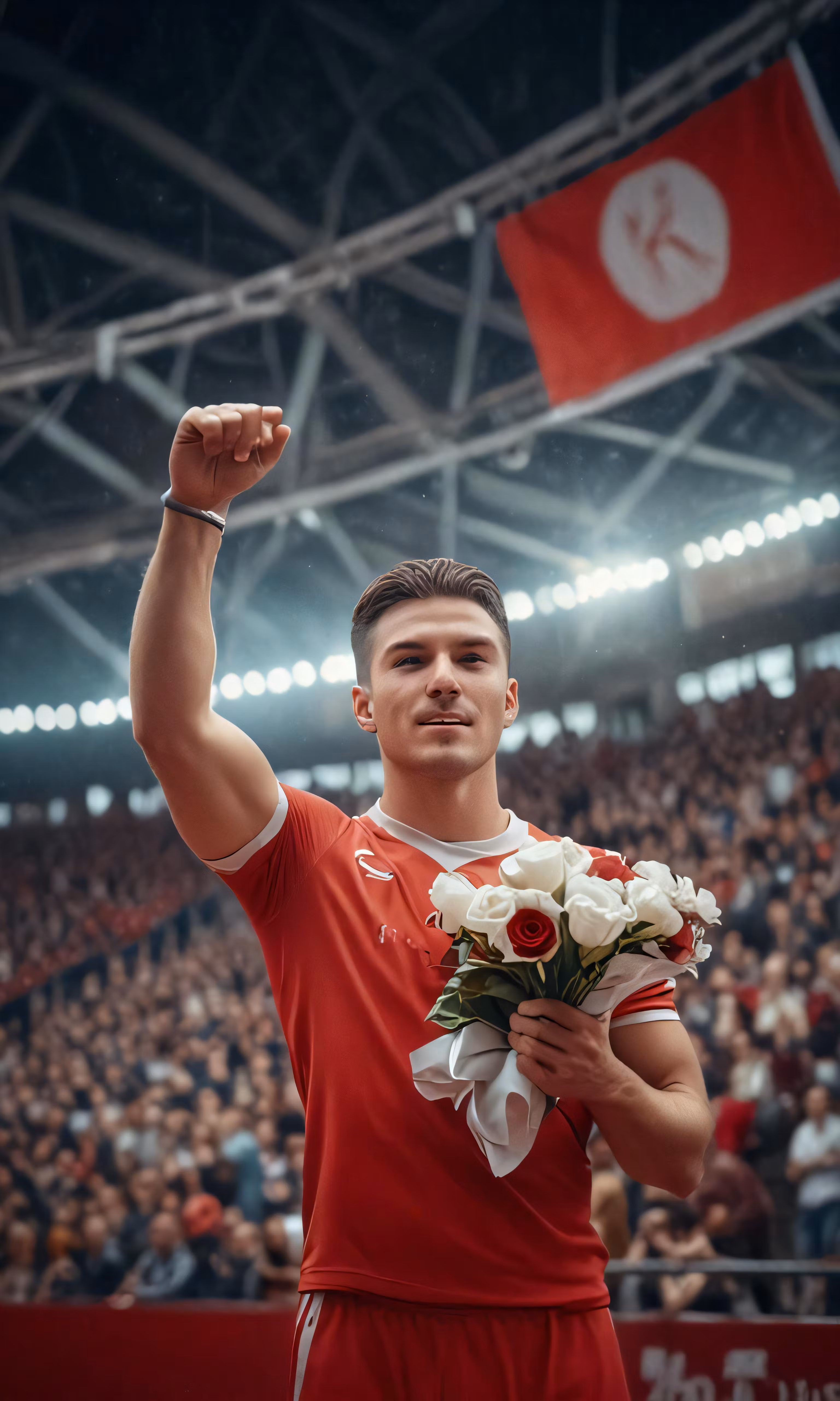 High resolution picture, free to use, a person holding flowers and waving at the camera