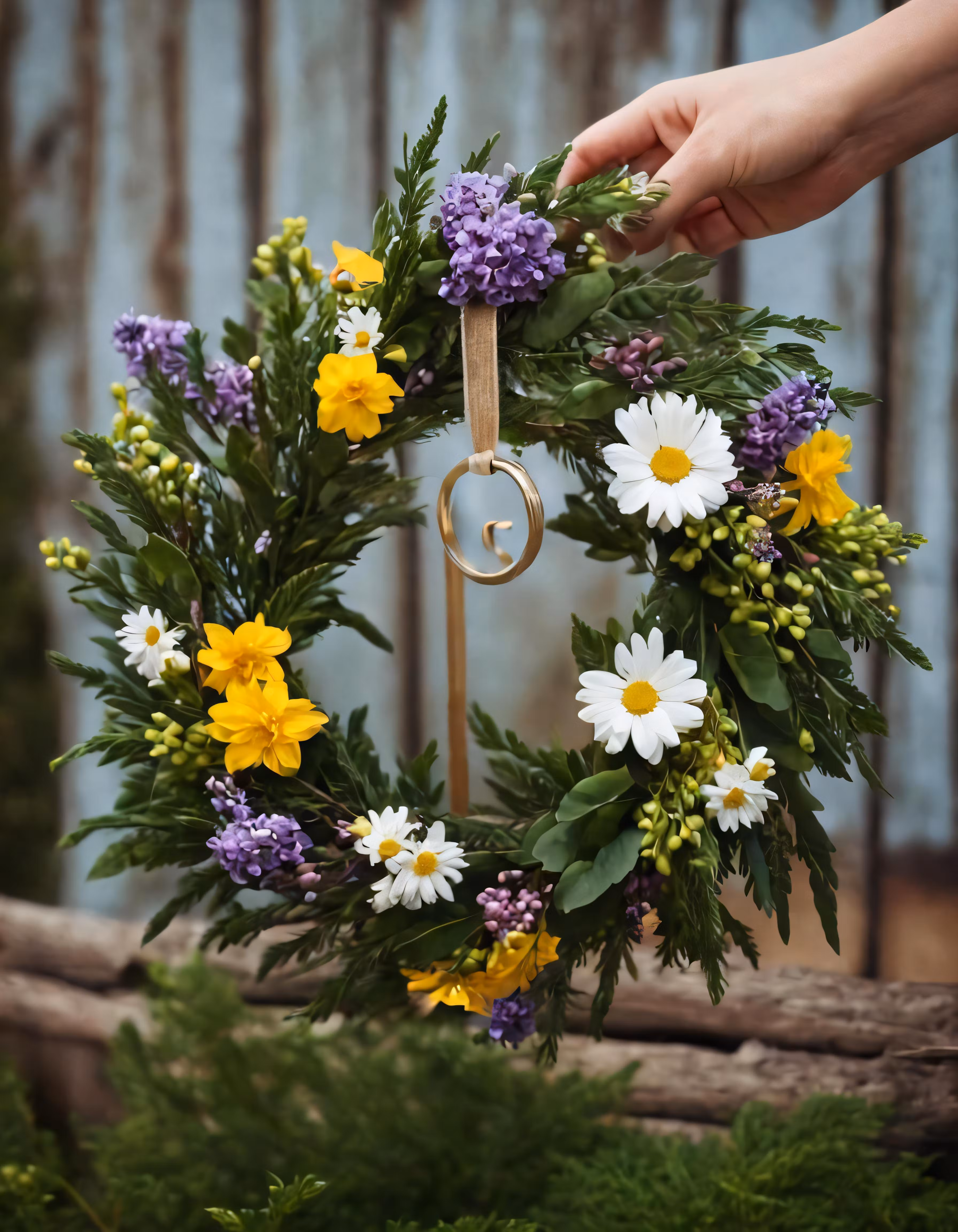 High resolution picture, free to use, a person holds a wreath with many flowers