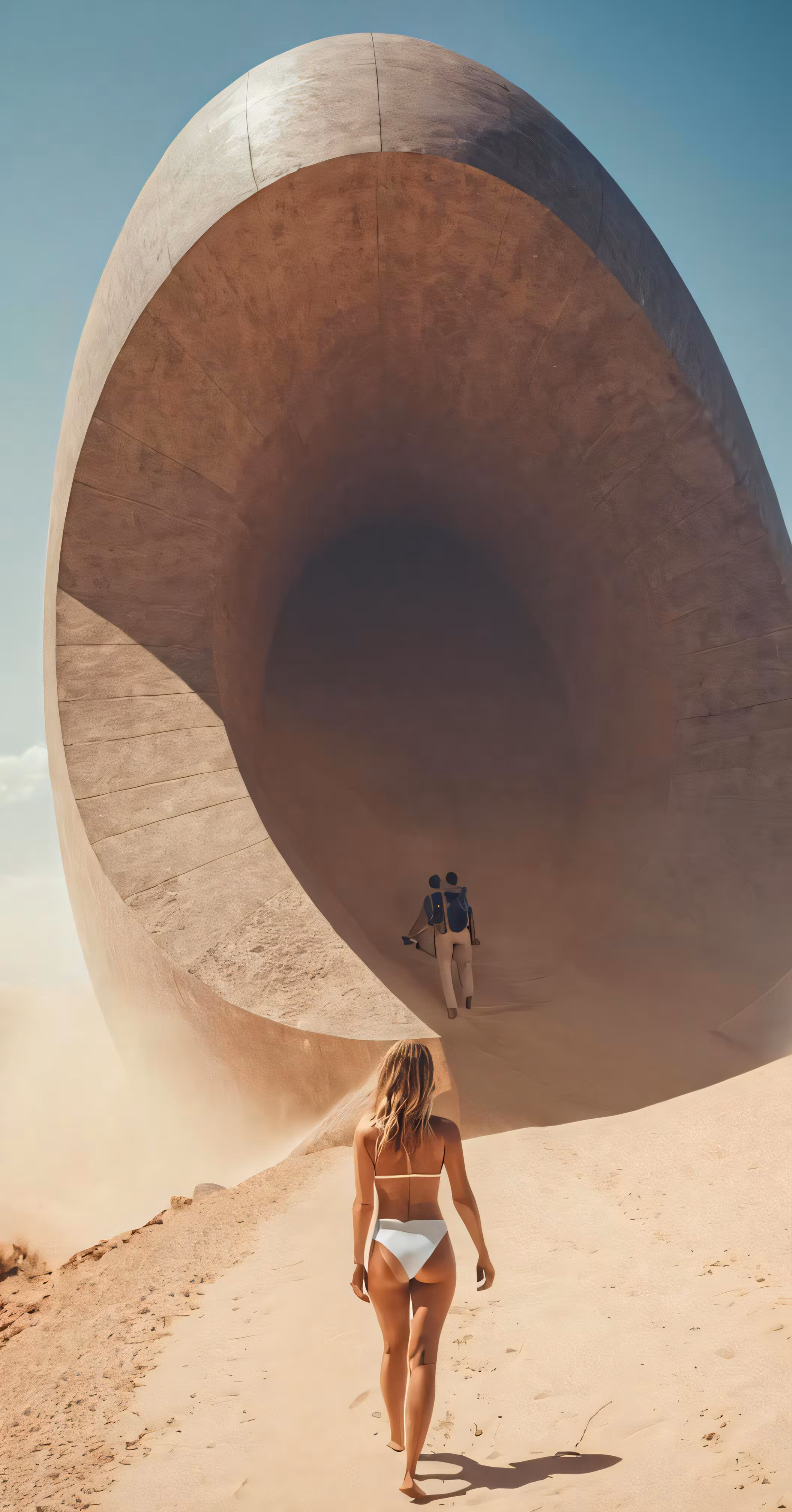 High resolution picture, free to use, a person in a bikini walks between large stone circles on the sand