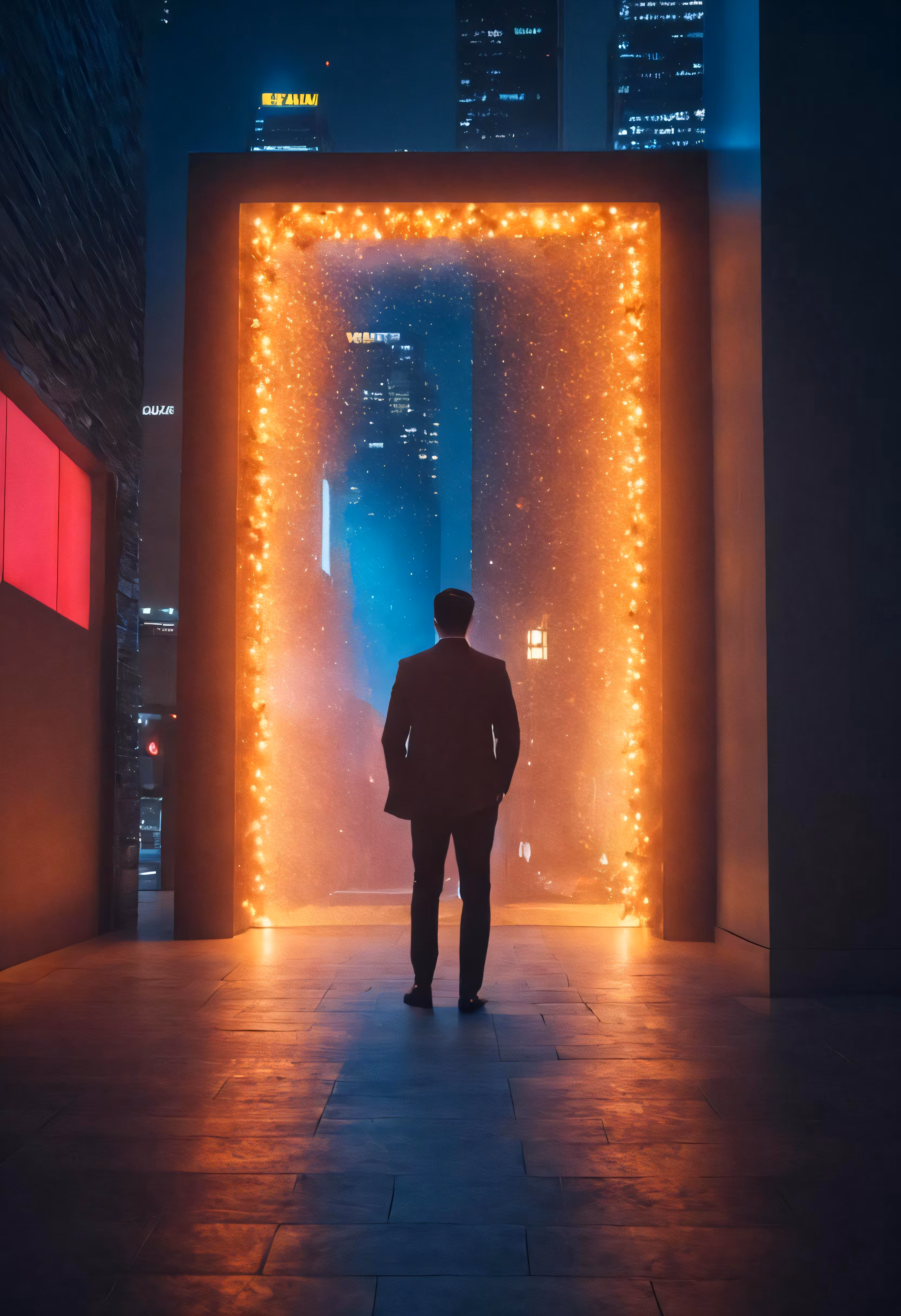 High resolution picture, free to use, a person in a large room with christmas lights