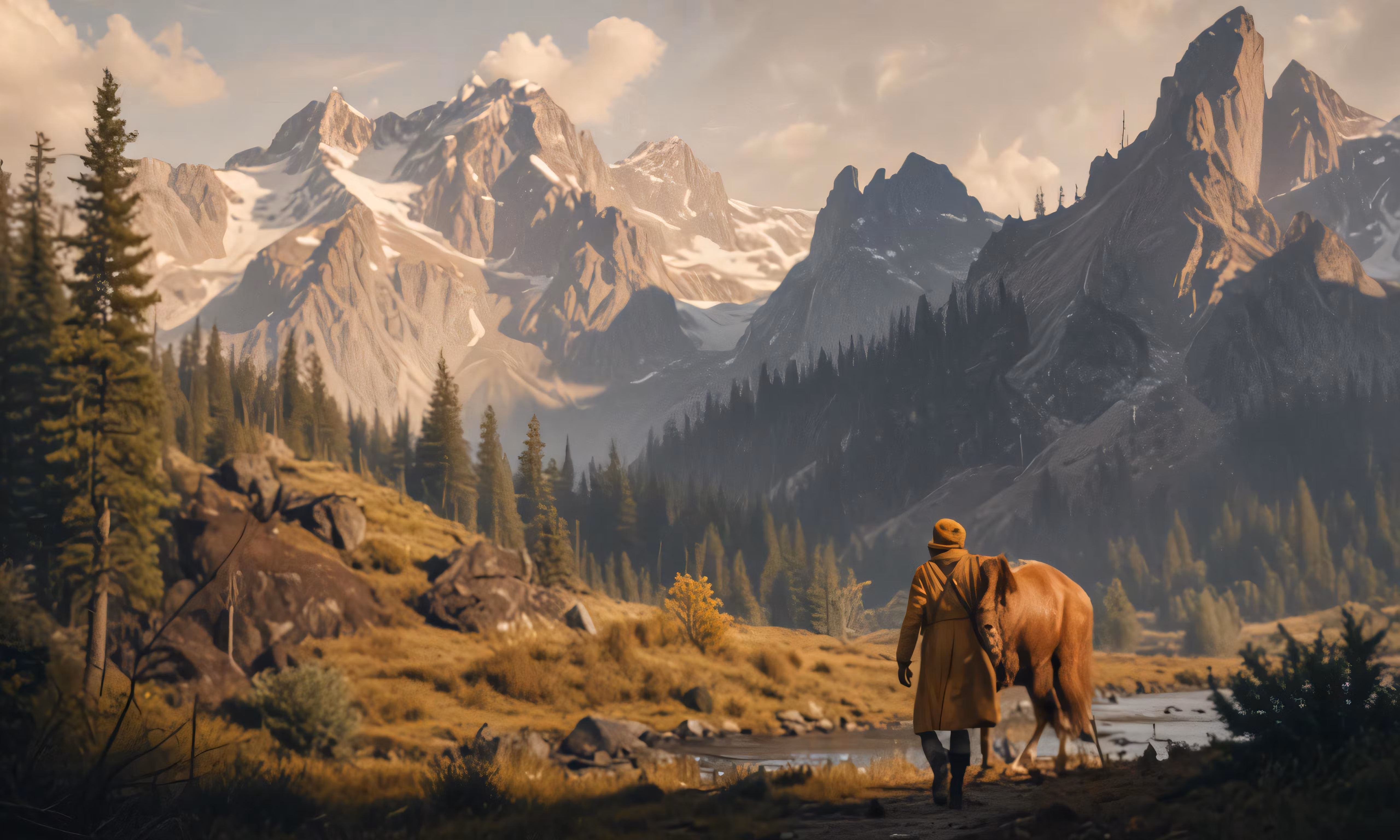 High resolution picture, free to use, a person in front of mountains and a mountain river
