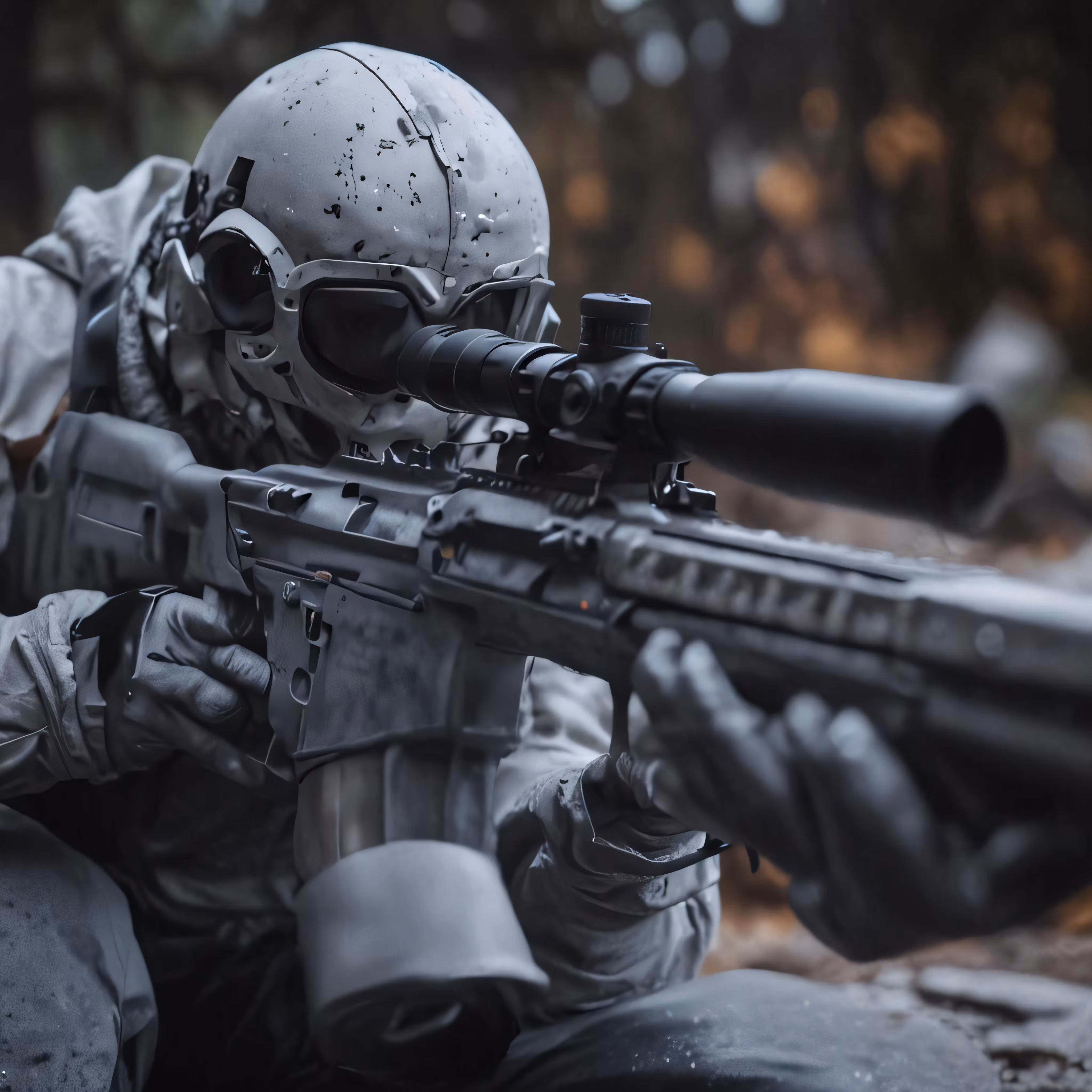 High resolution picture, free to use, a person in grey uniform with a gun on their lap