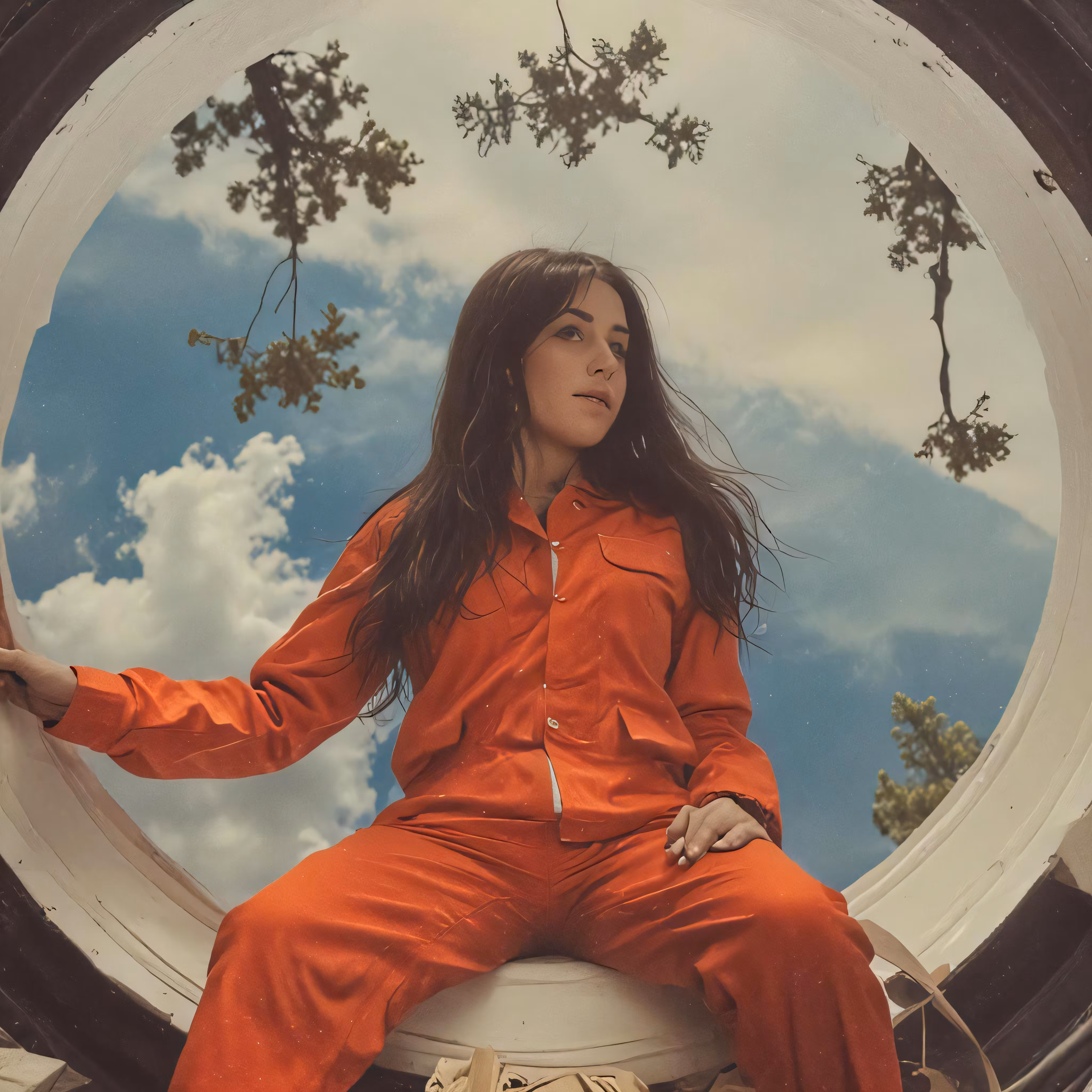 High resolution picture, free to use, a person in orange jumps sitting on top of a wall