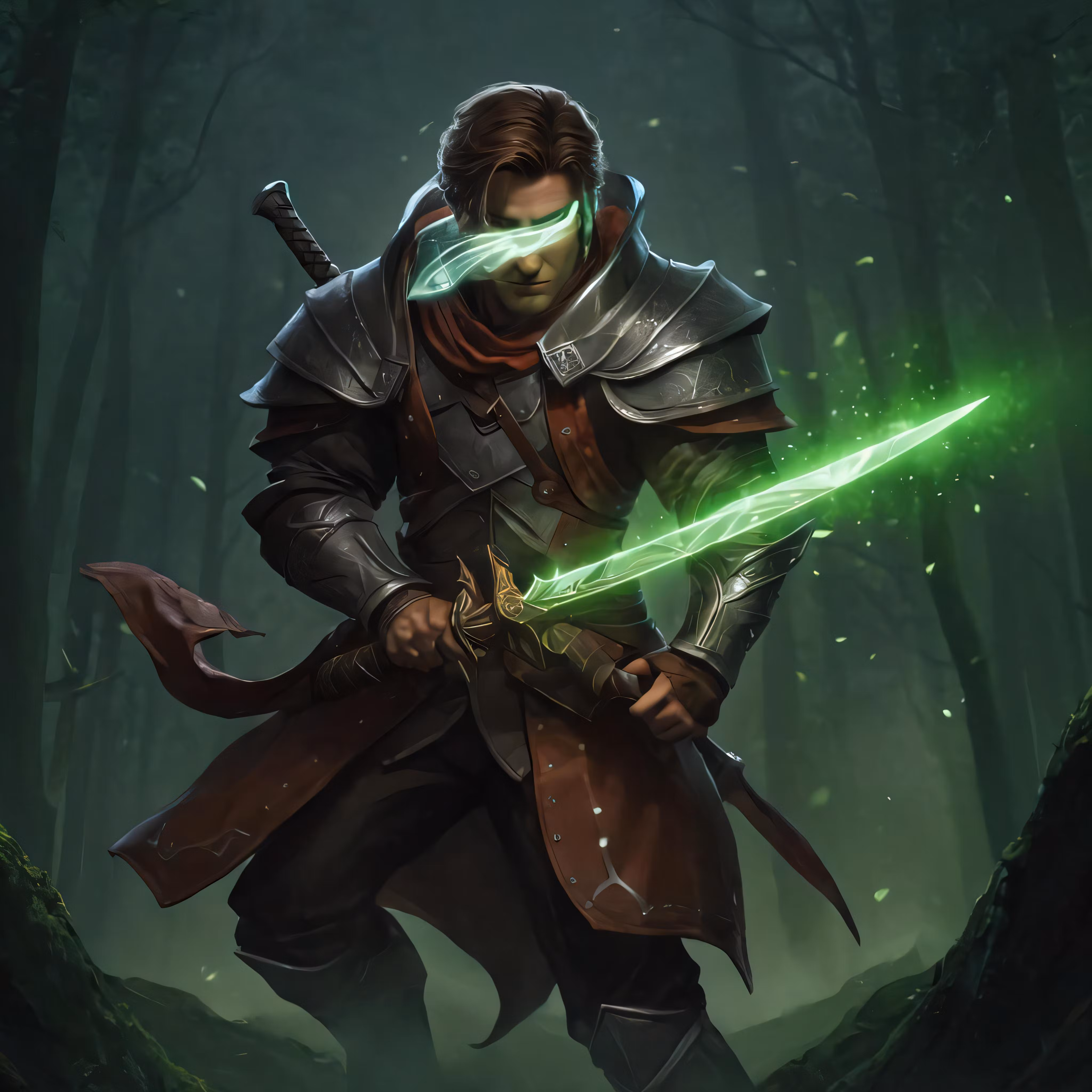 High resolution picture, free to use, a person in the middle of a forest holding an illuminated sword