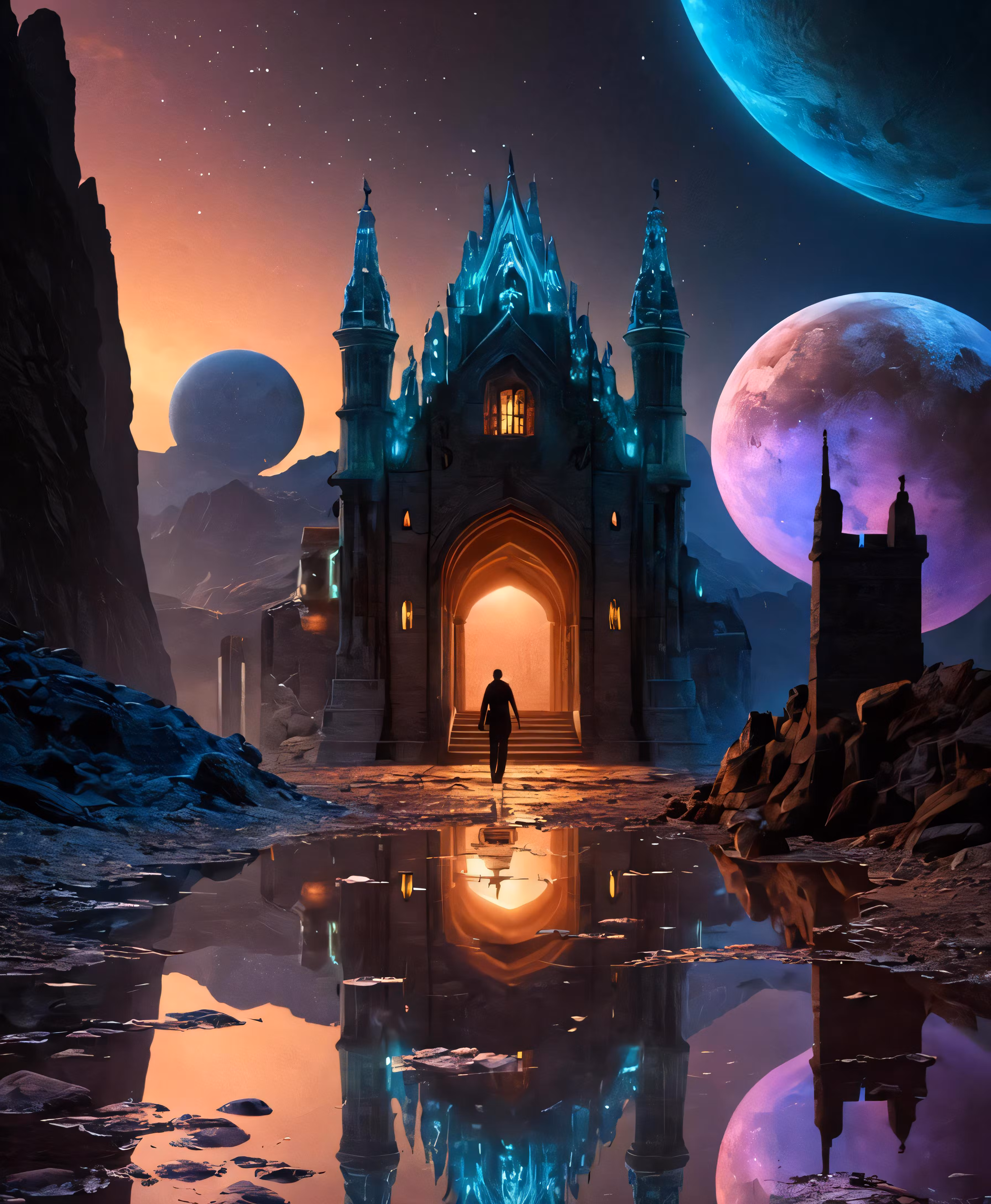 High resolution picture, free to use, a person is looking at a castle on the shore
